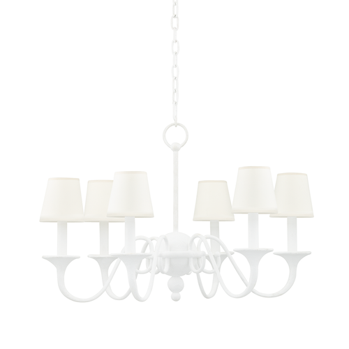 Intricately wrapped in white coconut shell beads, the enchanting Lewiston resembles an artifact pulled from the sea. Its gracefully looped arms form an oblong cage-like structure with a candle cluster nested inside. Suspended from a matching white chain, Lewiston is available in 6 and 8-light versions.