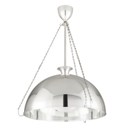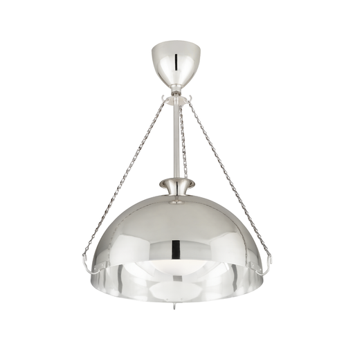 Large in scale and thoughtfully designed, Levette is statement lighting at its absolute finest. An eye-catching, shiny dome shade in real aged brass or aged silver is held aloft by a handmade Jack chain that hooks to a slender stem. The accent piece at the top of the shade adds an unexpected flair and coordinates beautifully with the cone-shaped canopy.