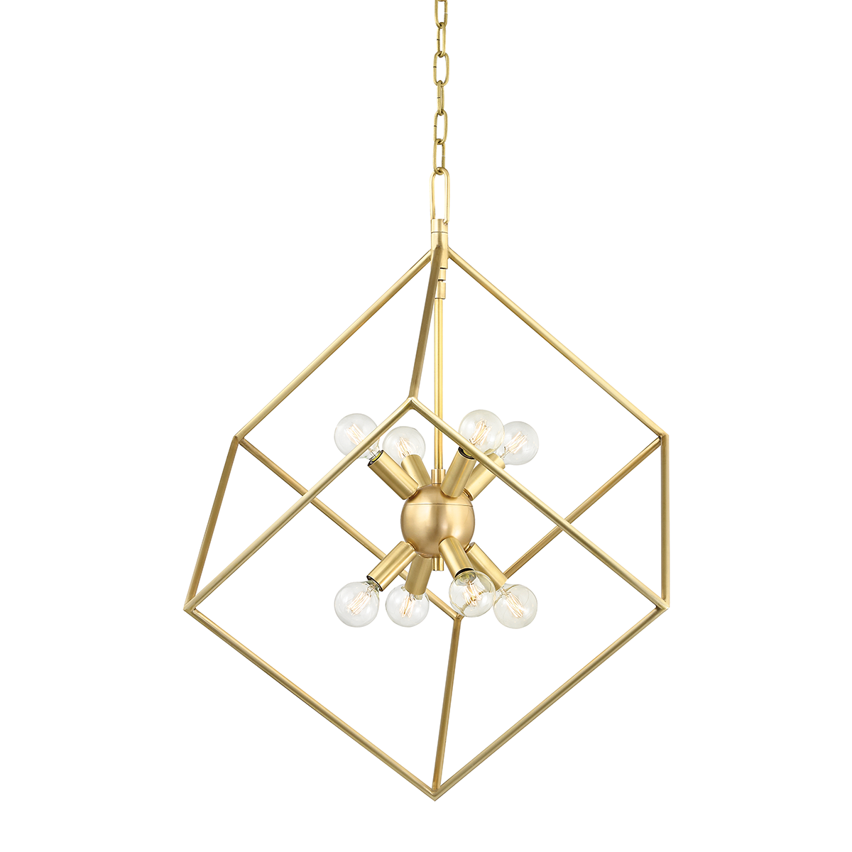 This impressive conversation starter features a series of ever-increasing cubes surrounding a Sputnik-style center. Choose from Aged Brass or Polished Nickel and multiple sizes to fit any space.