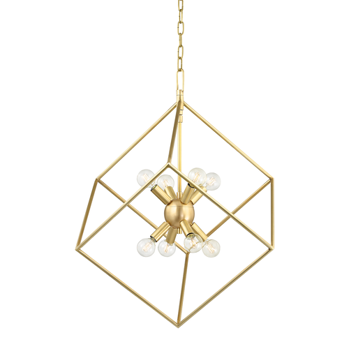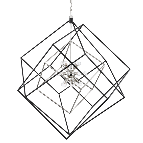This impressive conversation starter features a series of ever-increasing cubes surrounding a Sputnik-style center. Choose from Aged Brass or Polished Nickel and multiple sizes to fit any space.