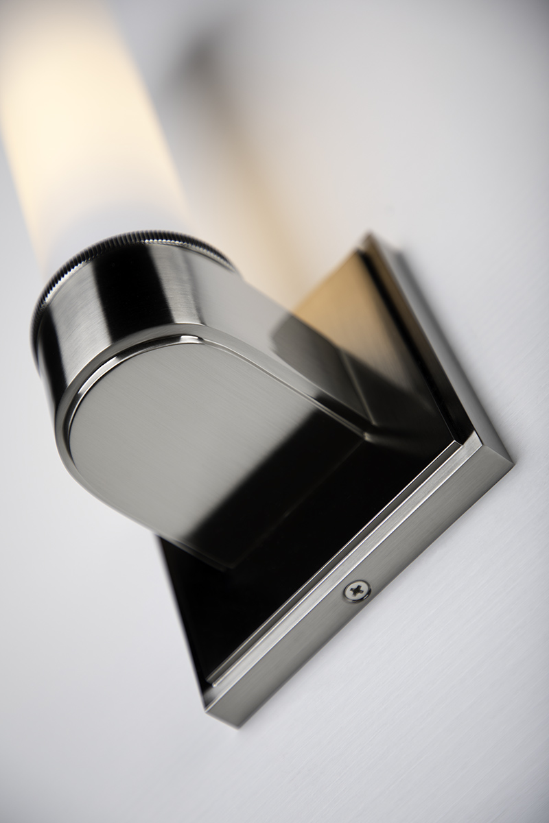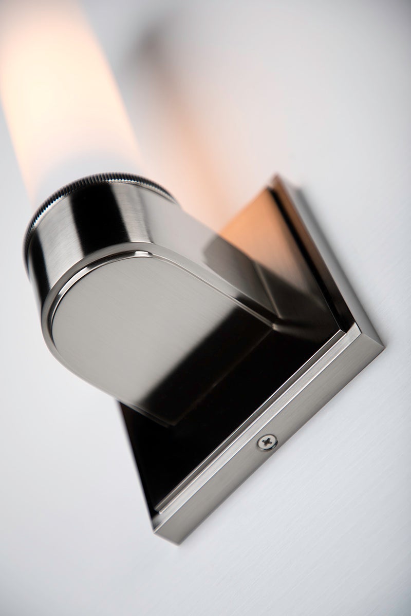 The subtle details are what make Mill Valley so special. Rings of knurled cast metal at the band and shade cap add texture, while the tiered, square baseplate adds dimension. Light diffuses through the opal matte glass creating a soft glow. This sleek fixture is not only beautiful in the bath, it adds style and shine wherever it goes. Designed to work in different spaces, the two light fixture can be mounted horizontally or vertically.