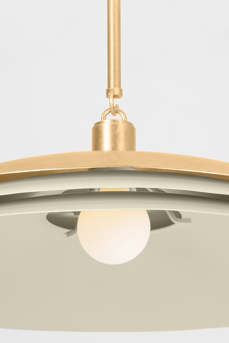Exhibiting graceful symmetry, Oneida revives Art Deco principles with contemporary simplicity. Artfully layered tiers of Vintage Gold Leaf and sand-hued plates create a streamlined vision that guides the direction of light. As either a pendant light or sconce, the understated elegance of Oneida shines through.
