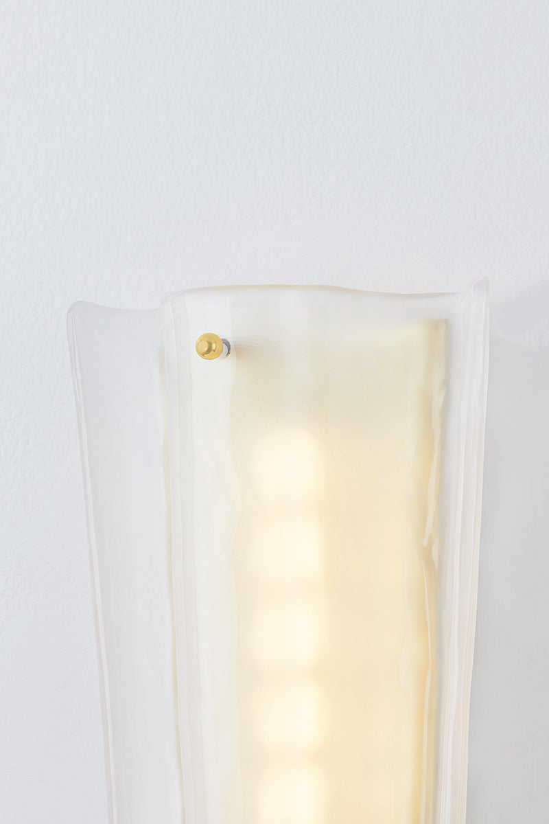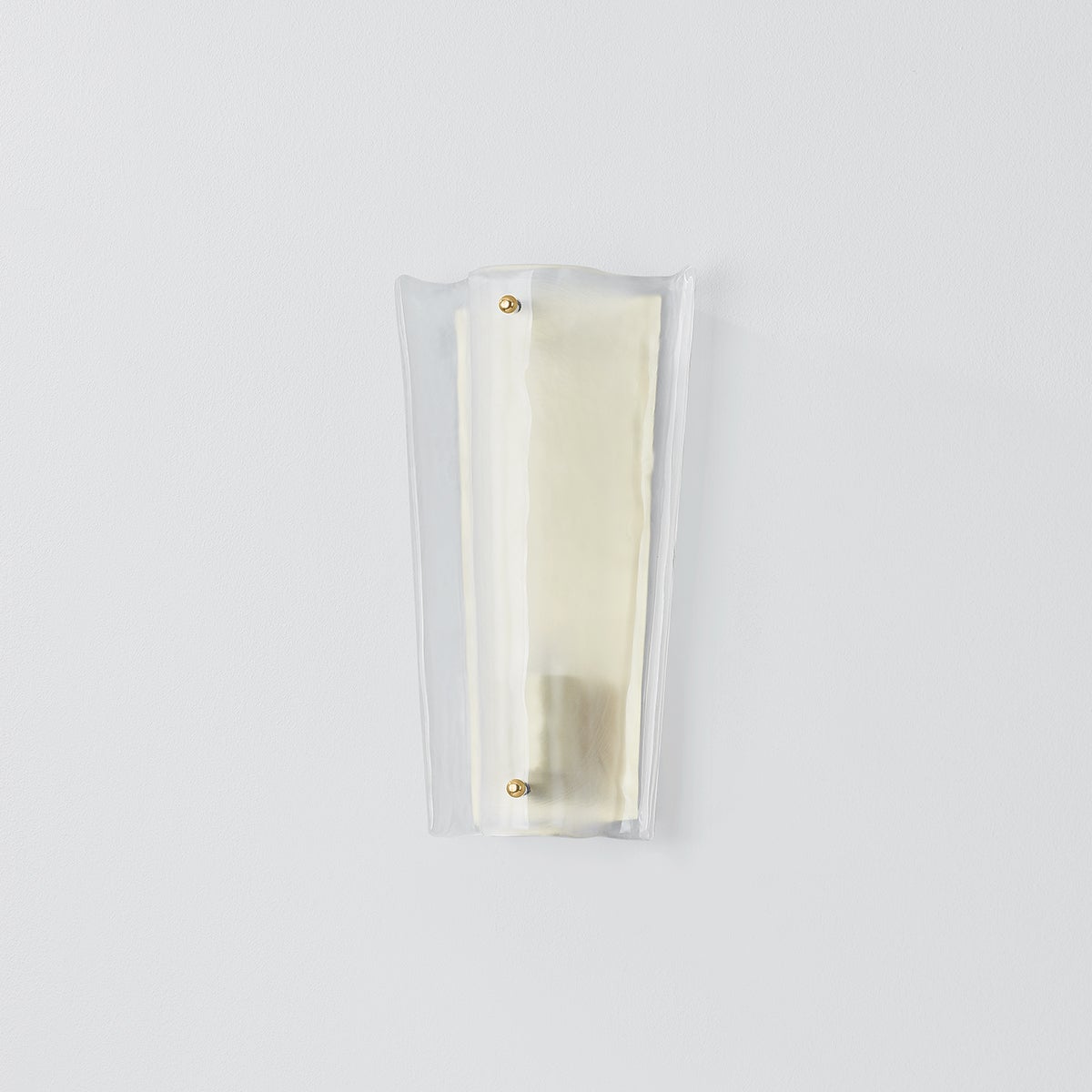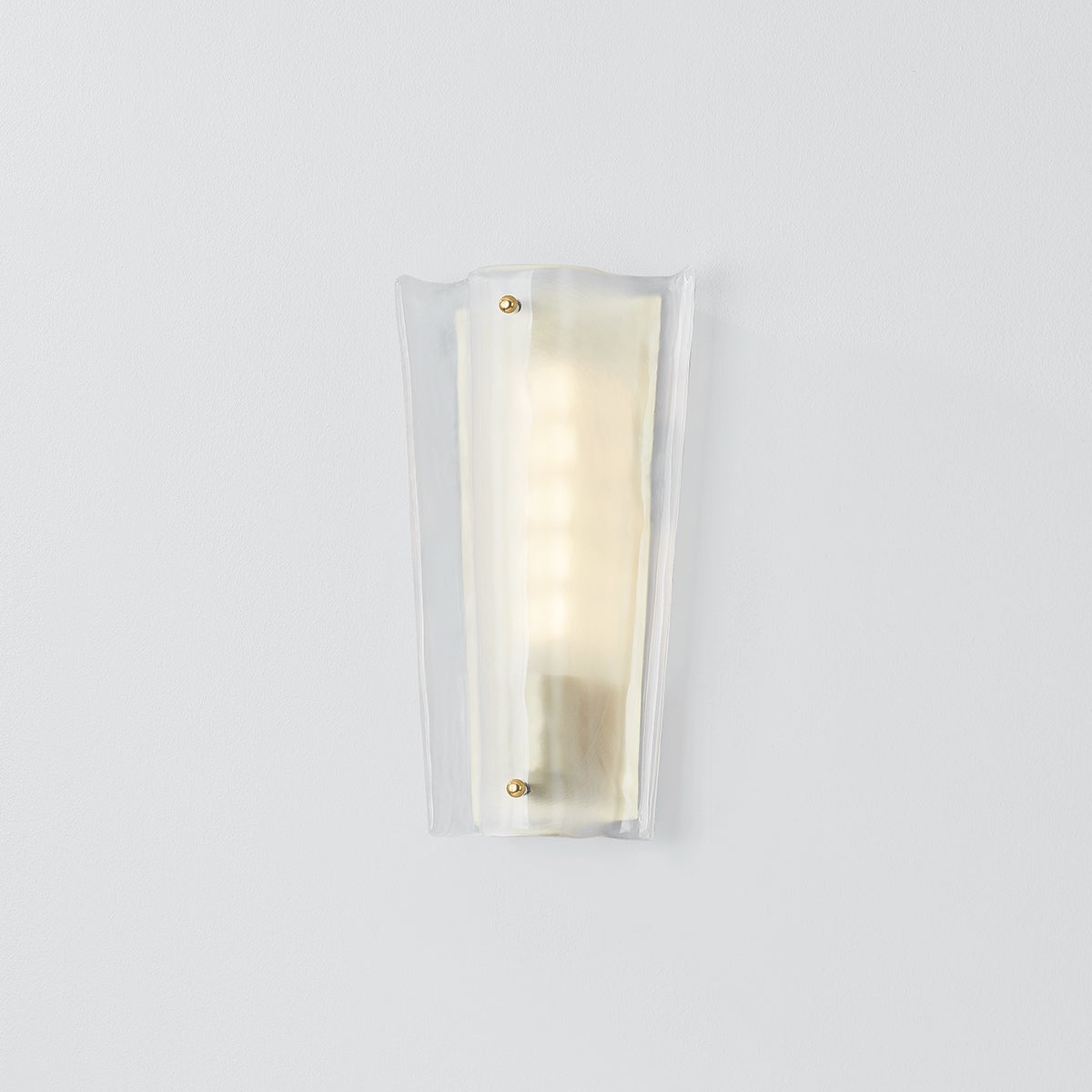 A single piece of folded piastre glass forms the ethereal silhouette of the Baxford sconce. Etched on the inside, the glass softens the light diffusion. The refined framework provides a glimmer of Aged Brass through the glass, adding structure and warmth.