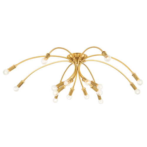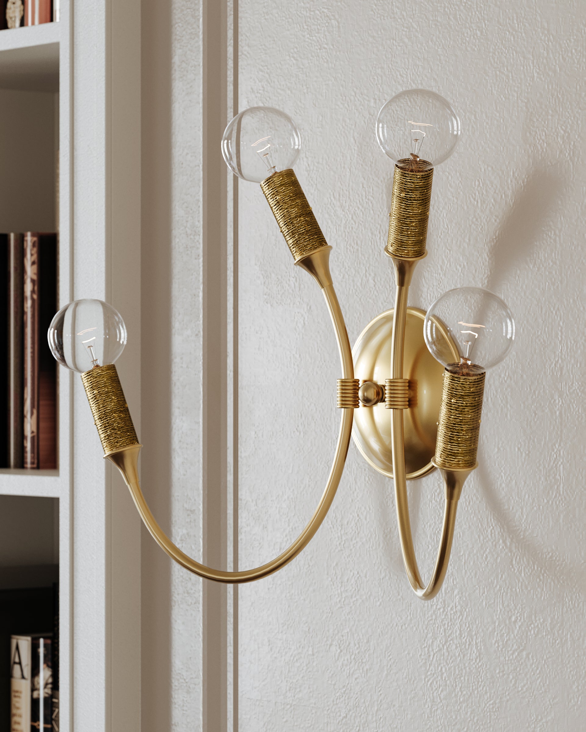 Amboy takes the traditional candelabra design and gives it a dazzling upgrade. Swooping aged brass arms hold brass wire-wrapped socket cups at each end. When unlit, the bulbs add to the beauty of the design and when lit, light reflects off the brass wire in a sparkling display.
