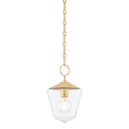 Defined by an octagonal-shaped, ribbed shade, Bennett is glass blowing at its finest. A single carbon filament bulb suspends from a metal bulb base and casts a clear, beautiful glow. Available as an eight, nine and 18-inch diameter pendant in Aged Brass and Polished Nickel finish.