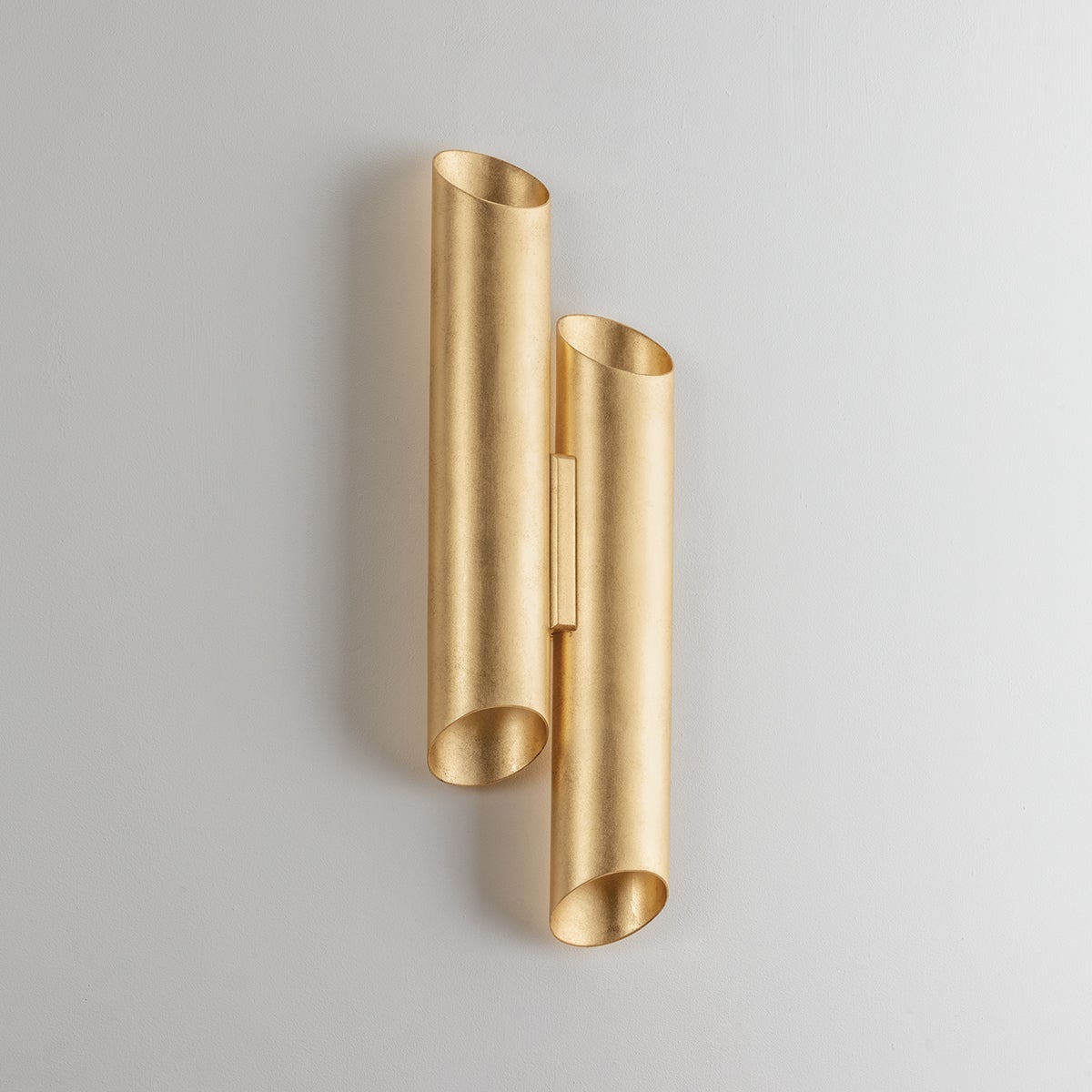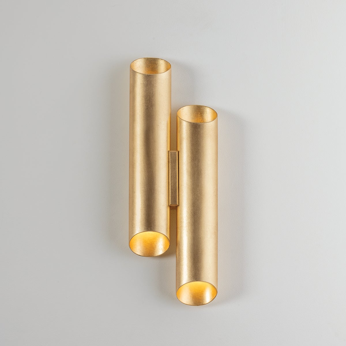 The eye-catching asymmetric design of Rylane features two vertical tubular shades finished in lustrous Vintage Gold Leaf. The cylindrical forms contain two lights each, directing light both up and down. Adding a romantic glow to soft lighting schemes, this organic-inspired sconce is a modern treasure.