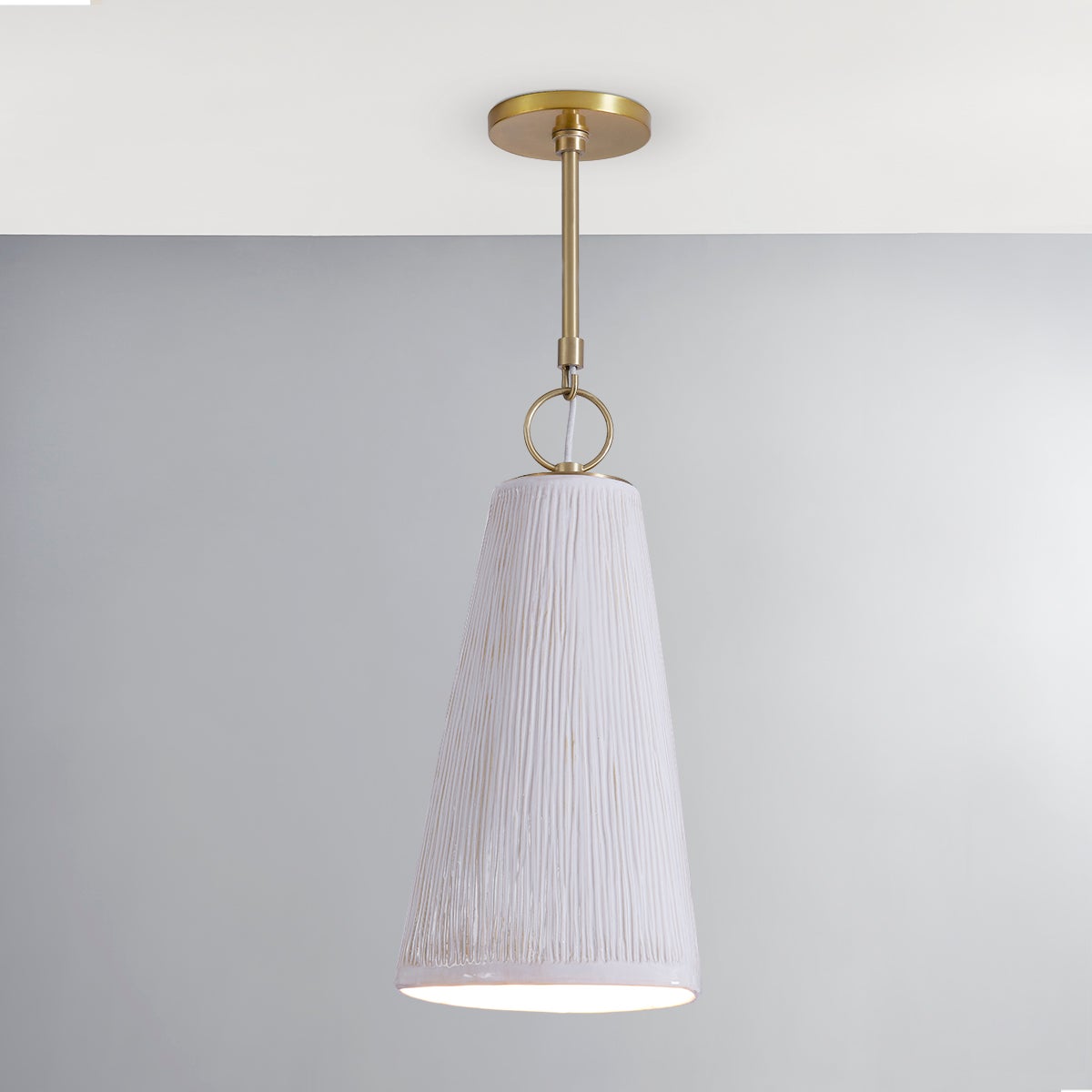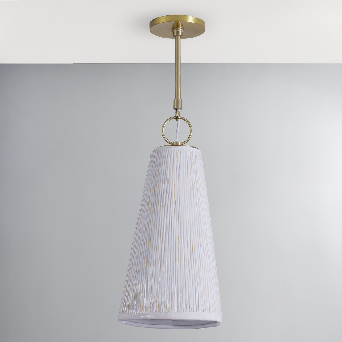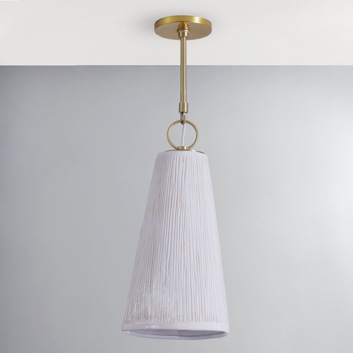 Dryden's satin white ceramic shade features an organic triangular shape and textured finish, giving the pendant a sense of natural movement. A smooth finished edge at the base and an Aged Brass hook and ring connecting the body to the stem add to the piece's elegance.