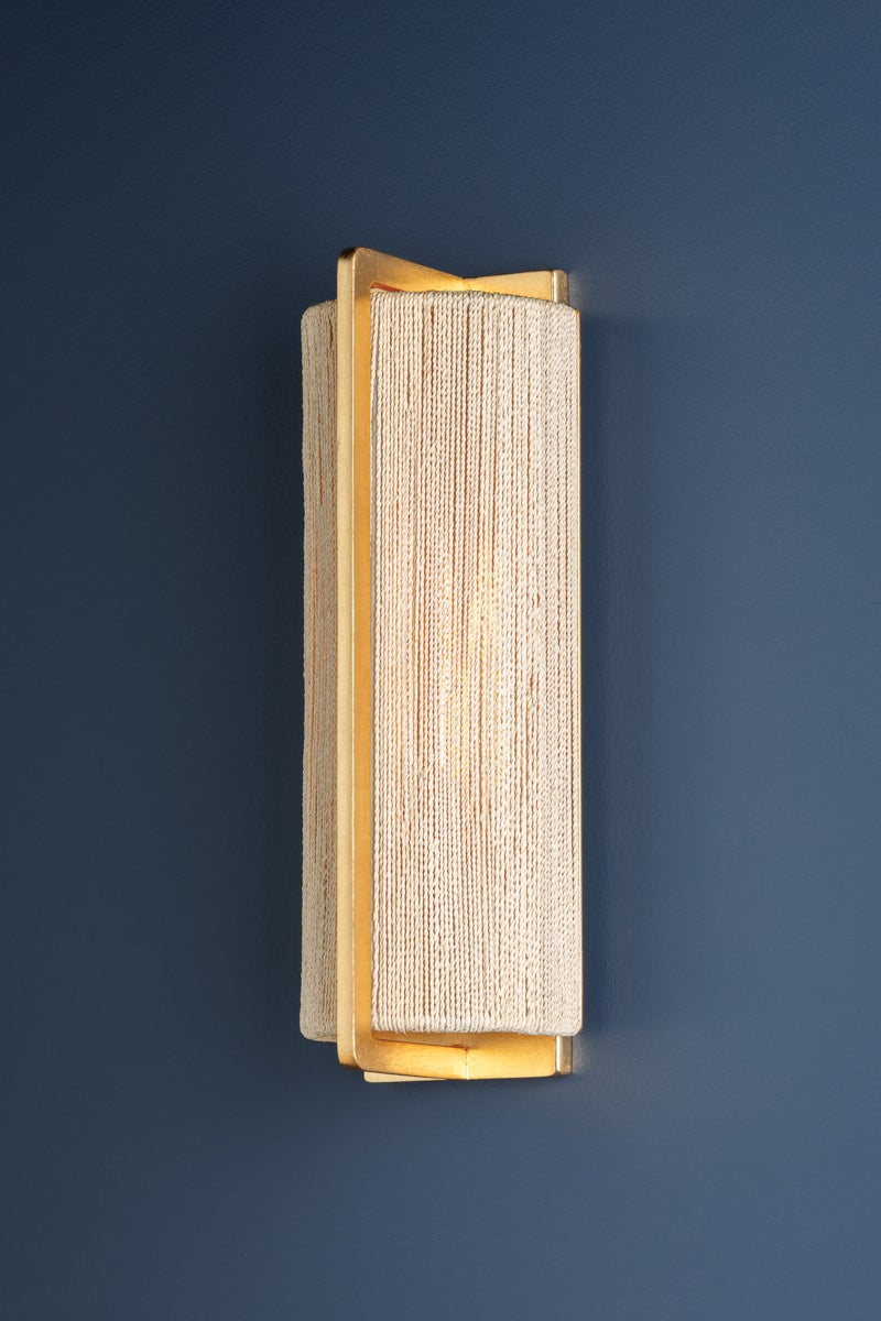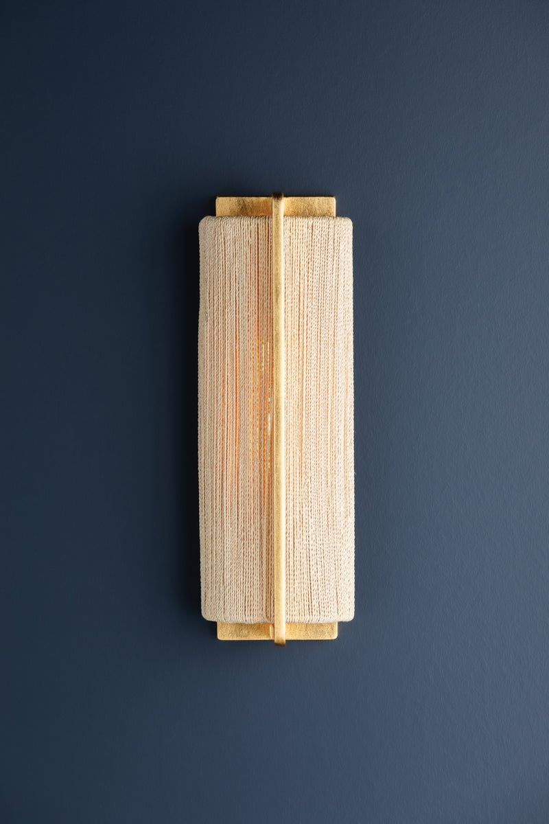 In a clever play on materiality, this sensory fixture transforms bleached Abaca rope into jewelry-like chains. The finely twisted ropes appear like delicate gold strands from afar but have a rustic quality that makes the fixture feel casual and coastal. Suspended by a thick Gold Leaf framework, Quebec is available in two sizes of chandelier as well as a sconce. The clear glass drum has been painted white for a soft, opaque effect that gently diffuses light.