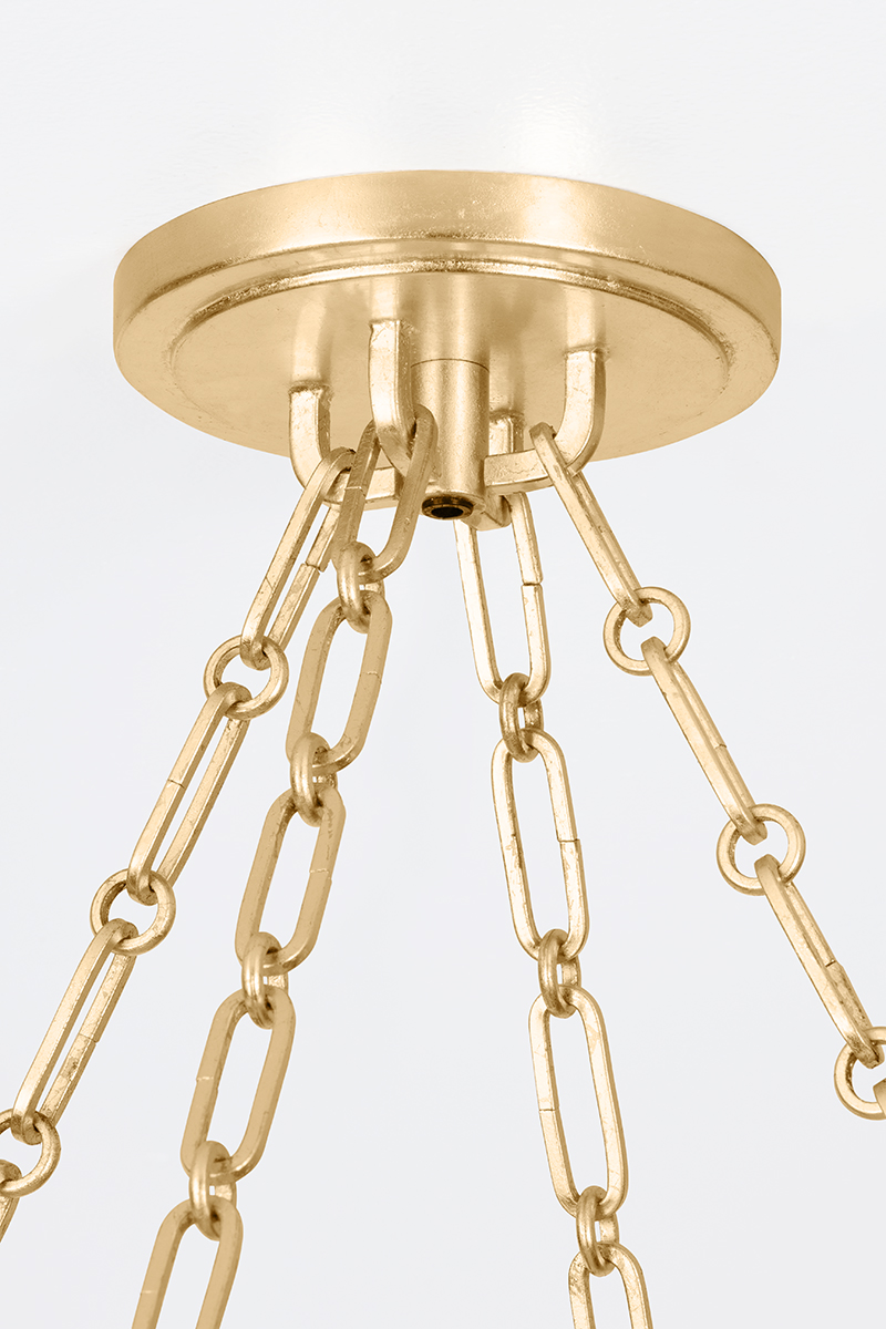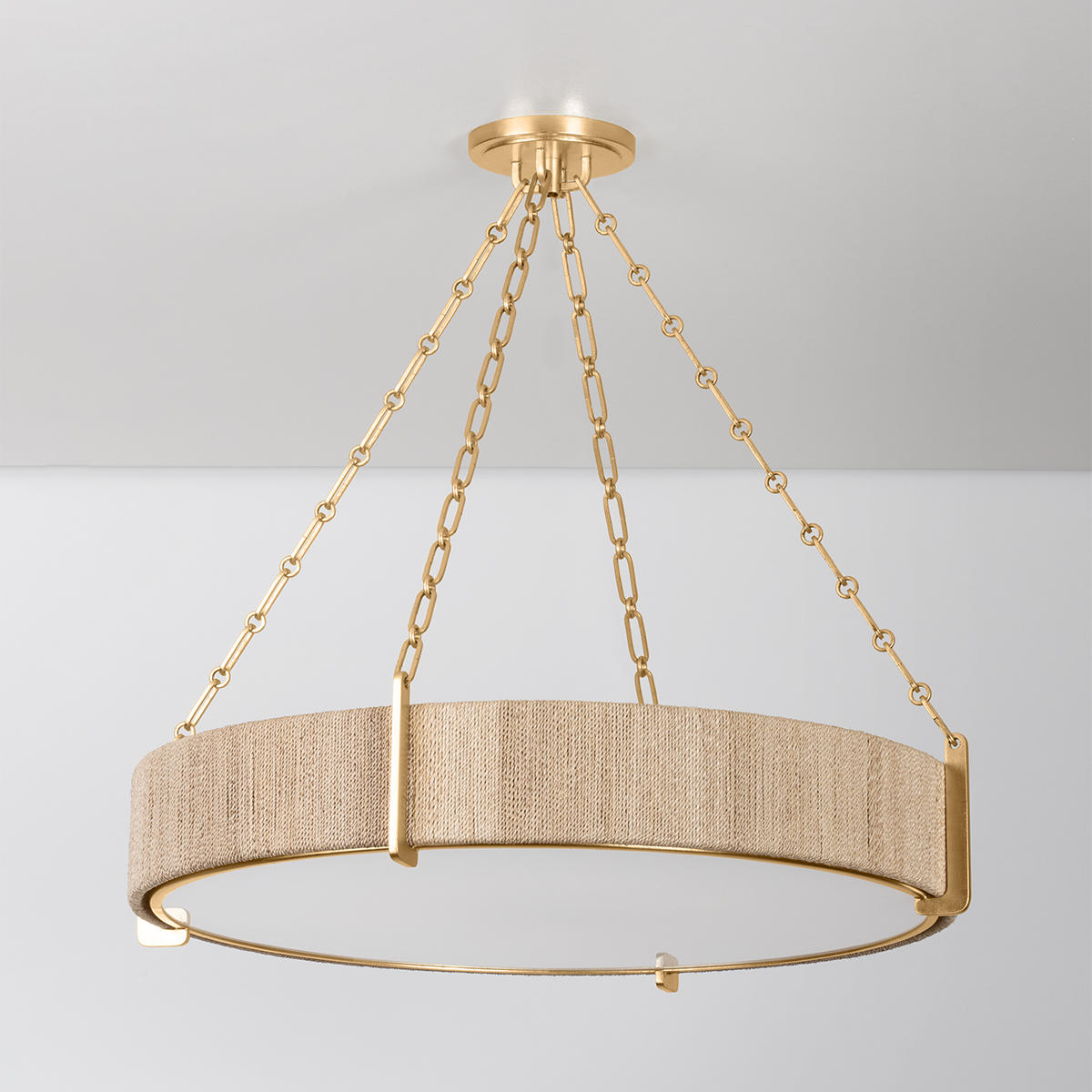 In a clever play on materiality, this sensory fixture transforms bleached Abaca rope into jewelry-like chains. The finely twisted ropes appear like delicate gold strands from afar but have a rustic quality that makes the fixture feel casual and coastal. Suspended by a thick Gold Leaf framework, Quebec is available in two sizes of chandelier as well as a sconce. The clear glass drum has been painted white for a soft, opaque effect that gently diffuses light.