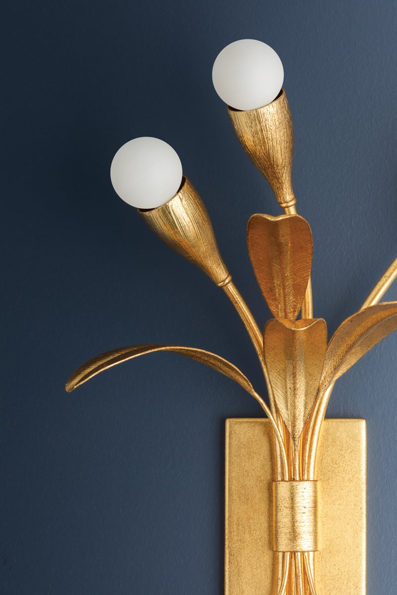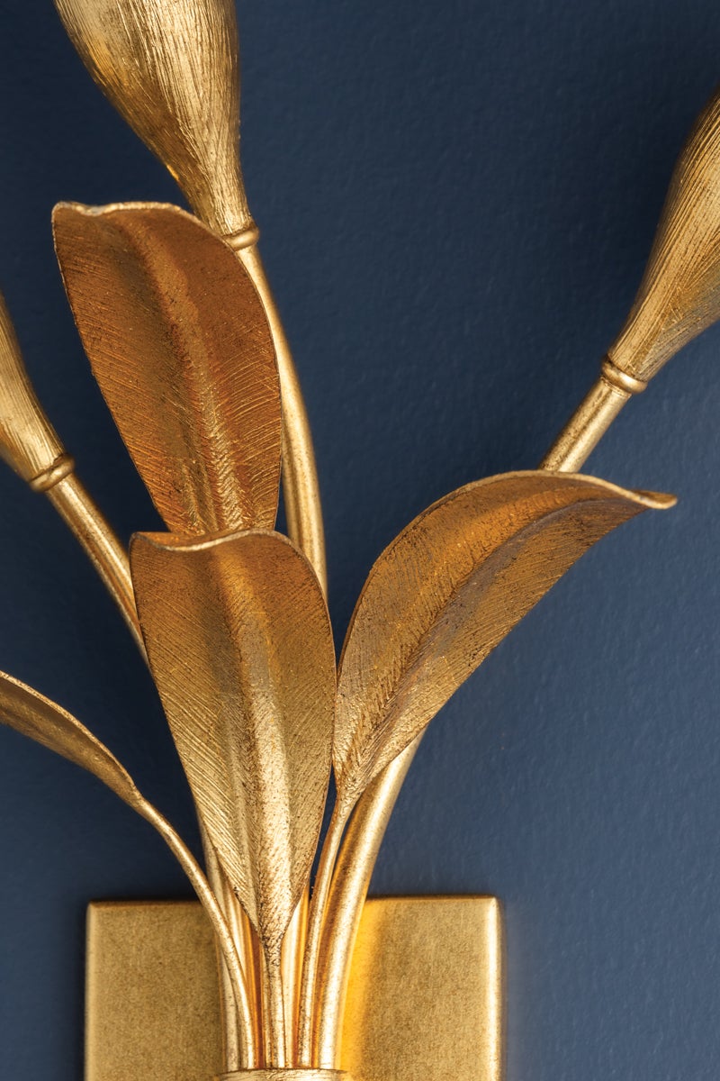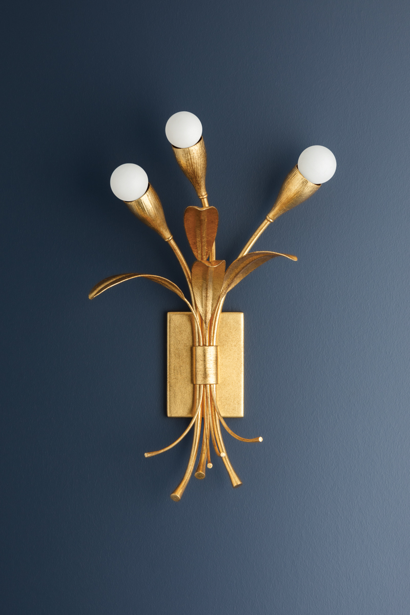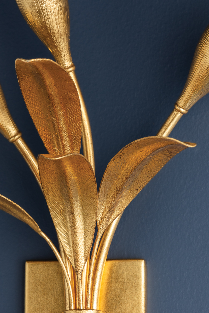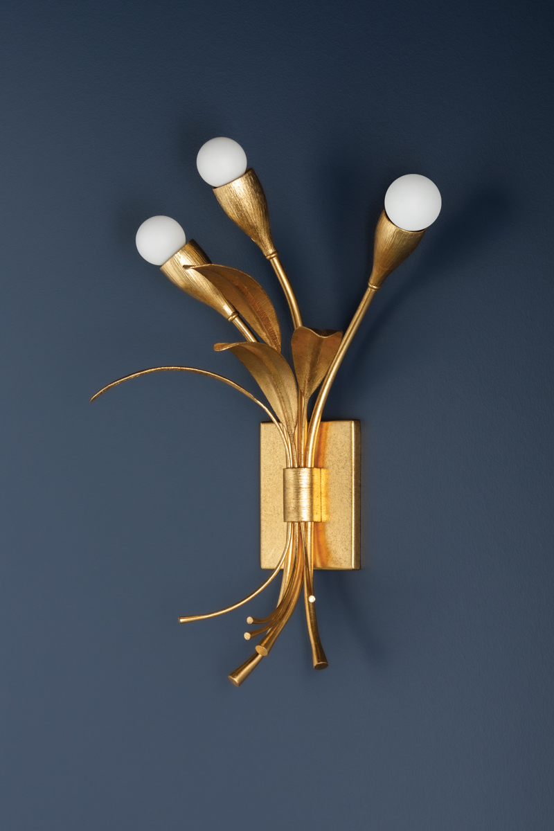 Creating a bouquet of light, the Bilston family features a cluster of lights inspired by botanical forms. The natural stem shapes, surface texture on the socket cups, and realistic leaves contribute to the artistry of this stunning family. Finished in Vintage Gold Leaf, Bilston is available in a 3-light wall sconce or 9 or 15-light chandelier.