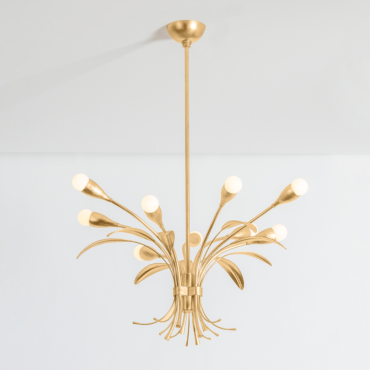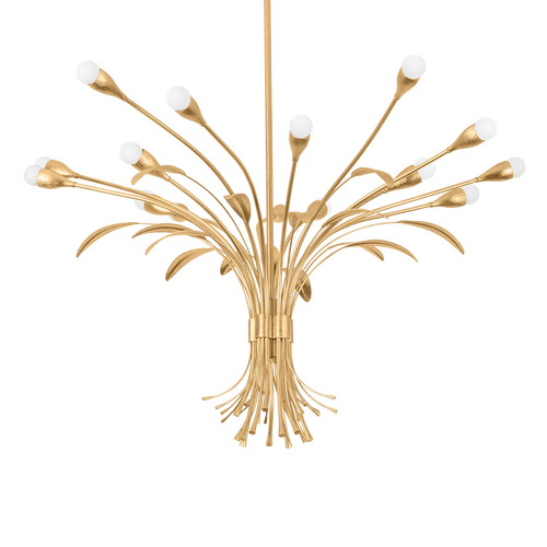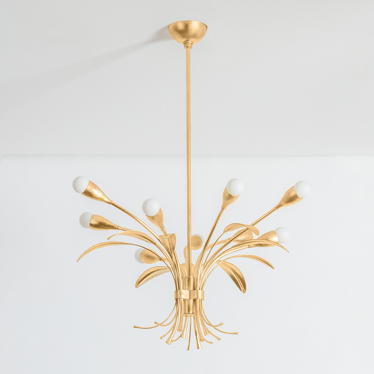 Creating a bouquet of light, the Bilston family features a cluster of lights inspired by botanical forms. The natural stem shapes, surface texture on the socket cups, and realistic leaves contribute to the artistry of this stunning family. Finished in Vintage Gold Leaf, Bilston is available in a 3-light wall sconce or 9 or 15-light chandelier.
