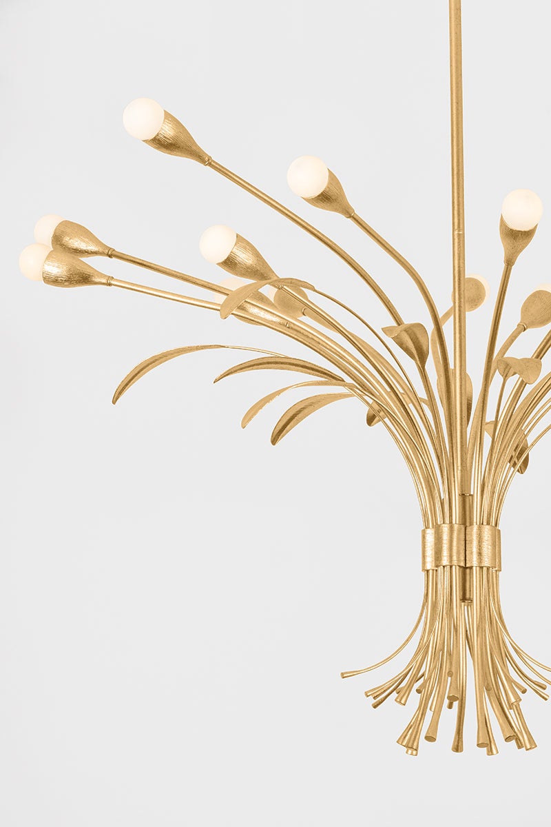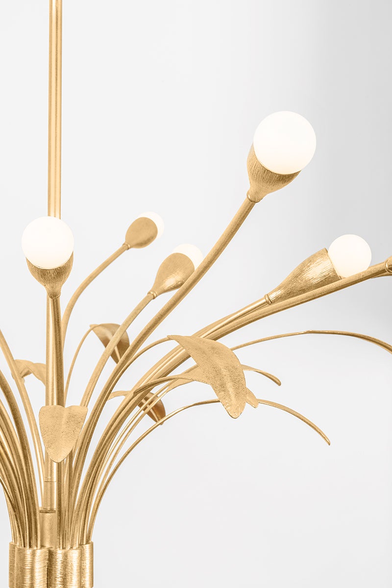 Creating a bouquet of light, the Bilston family features a cluster of lights inspired by botanical forms. The natural stem shapes, surface texture on the socket cups, and realistic leaves contribute to the artistry of this stunning family. Finished in Vintage Gold Leaf, Bilston is available in a 3-light wall sconce or 9 or 15-light chandelier.