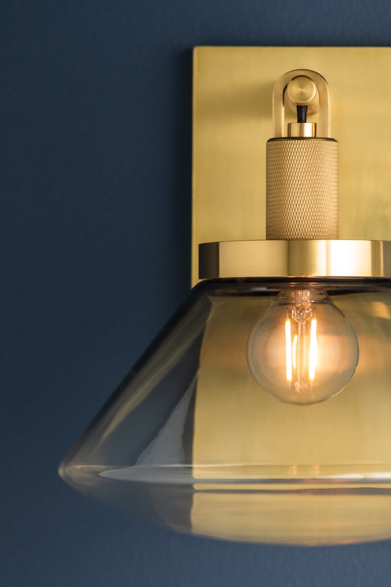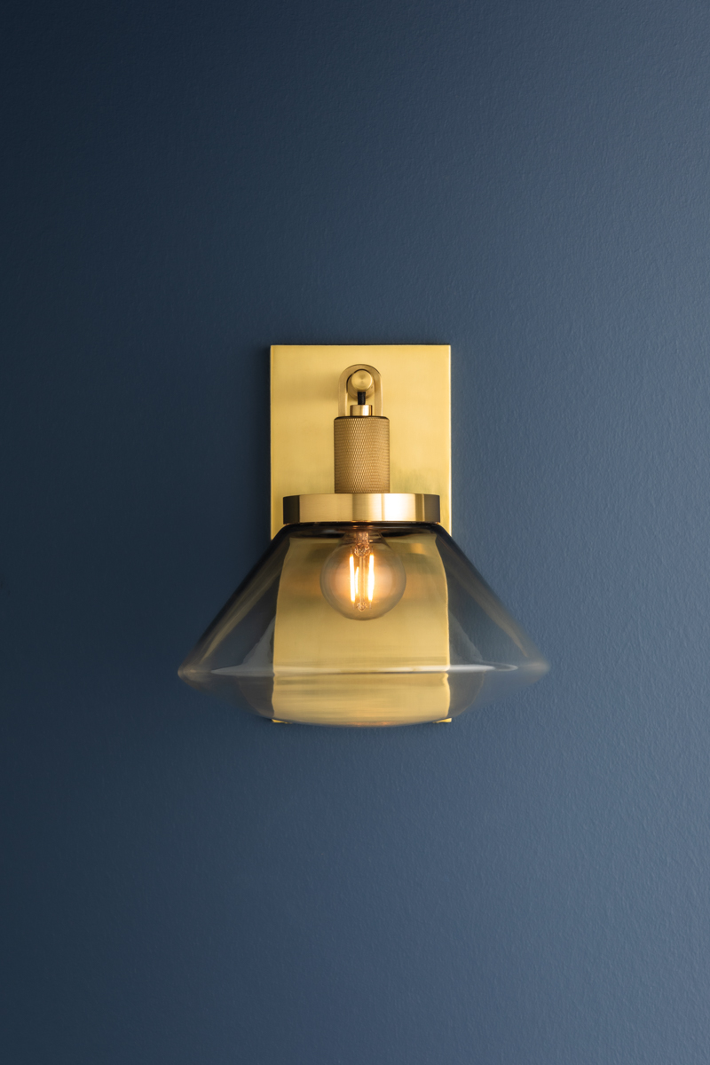 Taking an architectural approach to the mobile trend, Mendon features crisp, geometric details and distinctive gray glass. The overall composition is well-balanced, using asymmetry as a form of artistry. The thick glass shades are smoky and alluring, adding interest to the clean lines, while the Aged Brass finish strikes a warm note. Available as a 6-light chandelier or single-light sconce.