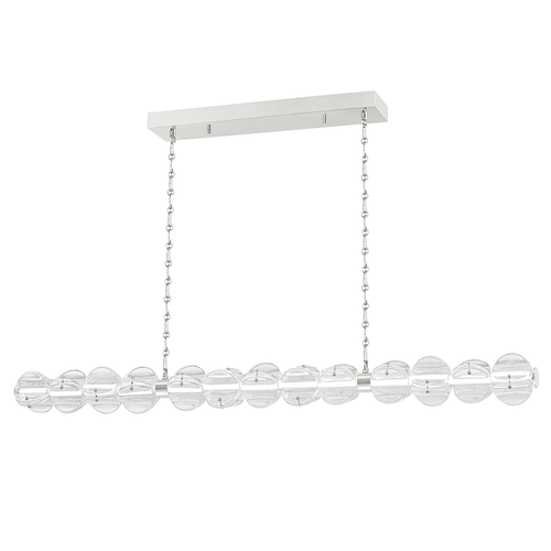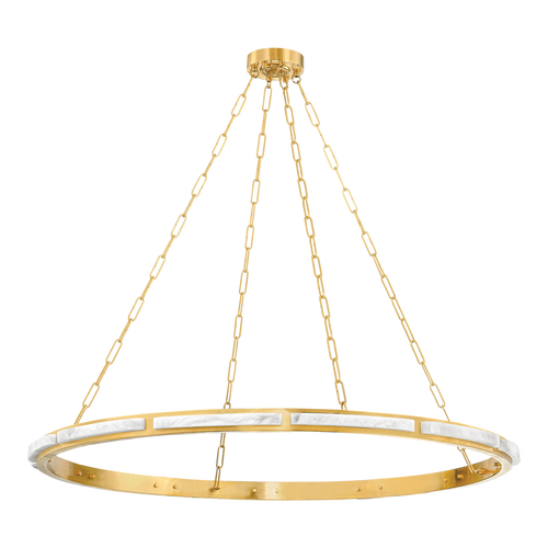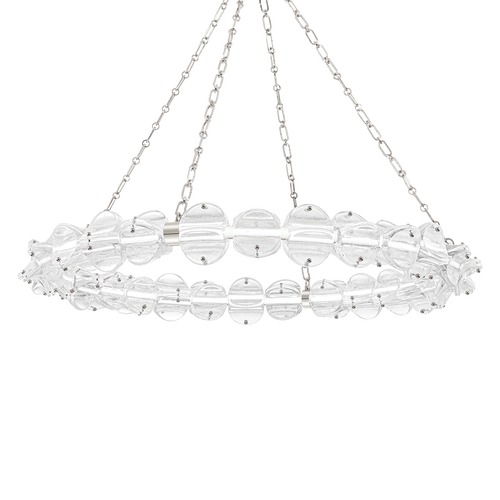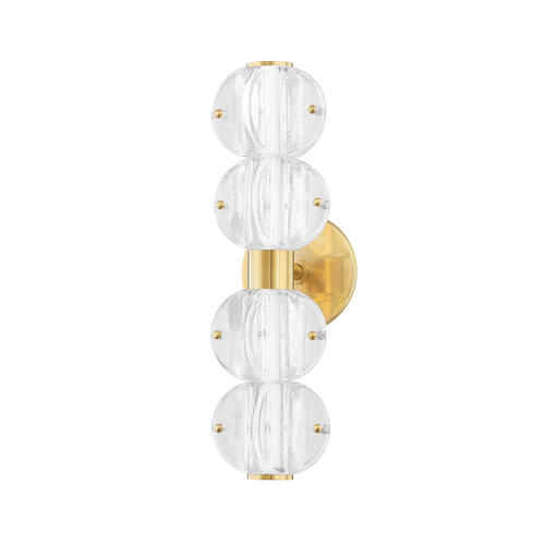 Circular motifs, textural glass, and jewelry-like pins and clasps embellish the graceful fixtures of the Lindley family. Molded and strung along the frame like beads, the three-dimensional glass discs create a scalloped-edge silhouette. The fixtures in this family range from a small sconce to a large-scale ring chandelier, marrying timeless materials with on-trend shapes. Choose from classic Aged Brass or a more contemporary Polished Nickel finish.