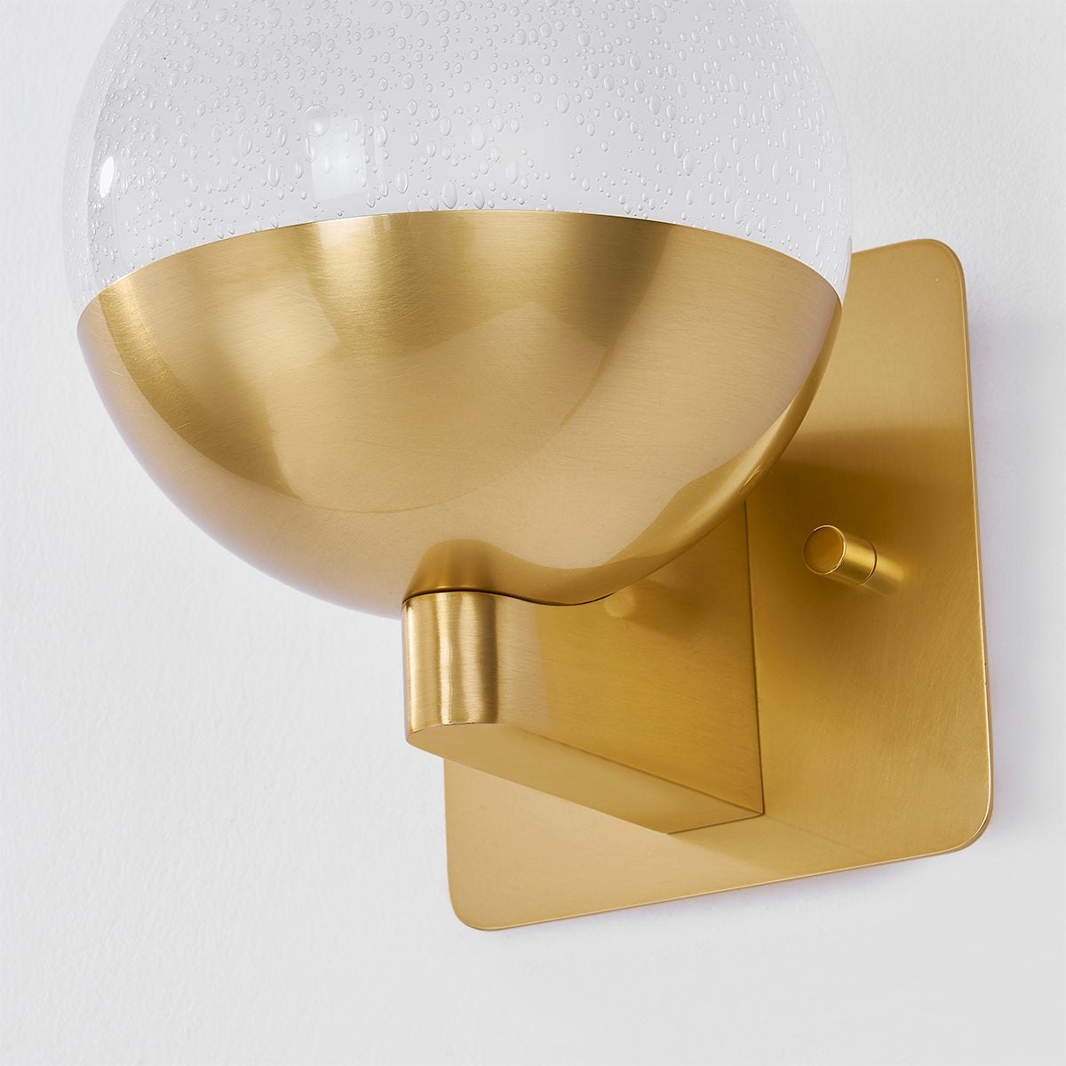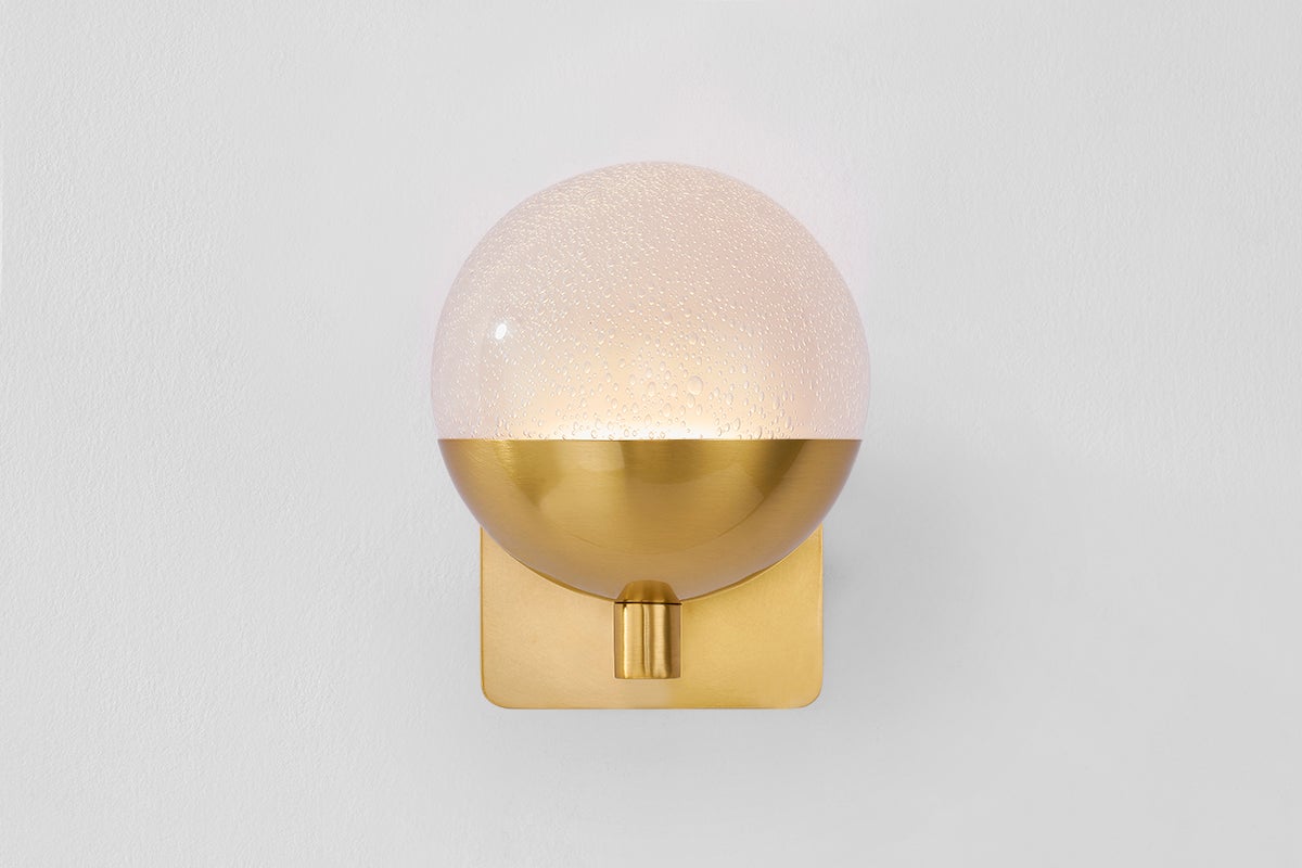 This celestial-inspired sconce features a single large orb suspended on a sleek backplate. The lower half of the fixture is finished in either Aged Brass or Polished Nickel, while the upper half is made from bubbled sprite glass. Powered by energy-efficient LED, Rochford illuminates large areas with an effervescent glow.