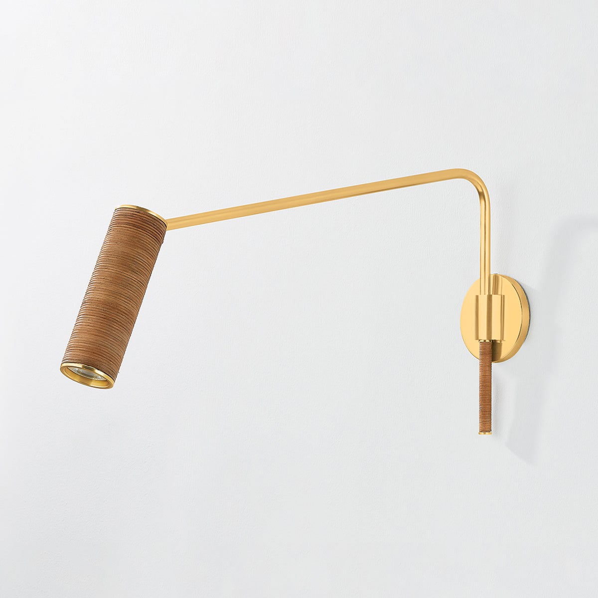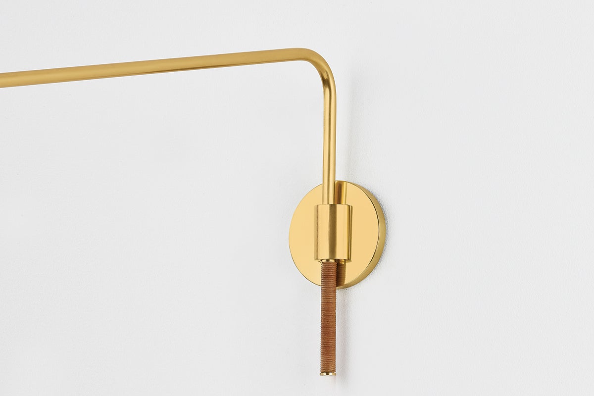 The Narragansett family tells an innovative design story marked by the use of tactile materials. While the silhouette of this sconce and floor lamp are understated, the Aged Brass metalwork and rattan-wrapped details mix hard and soft, manmade and natural. The elongated swing arm feature makes Narragansett perfect for bedside, desk, or reading nook illumination.