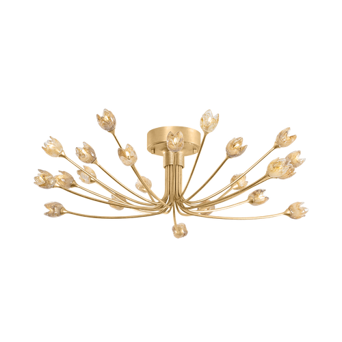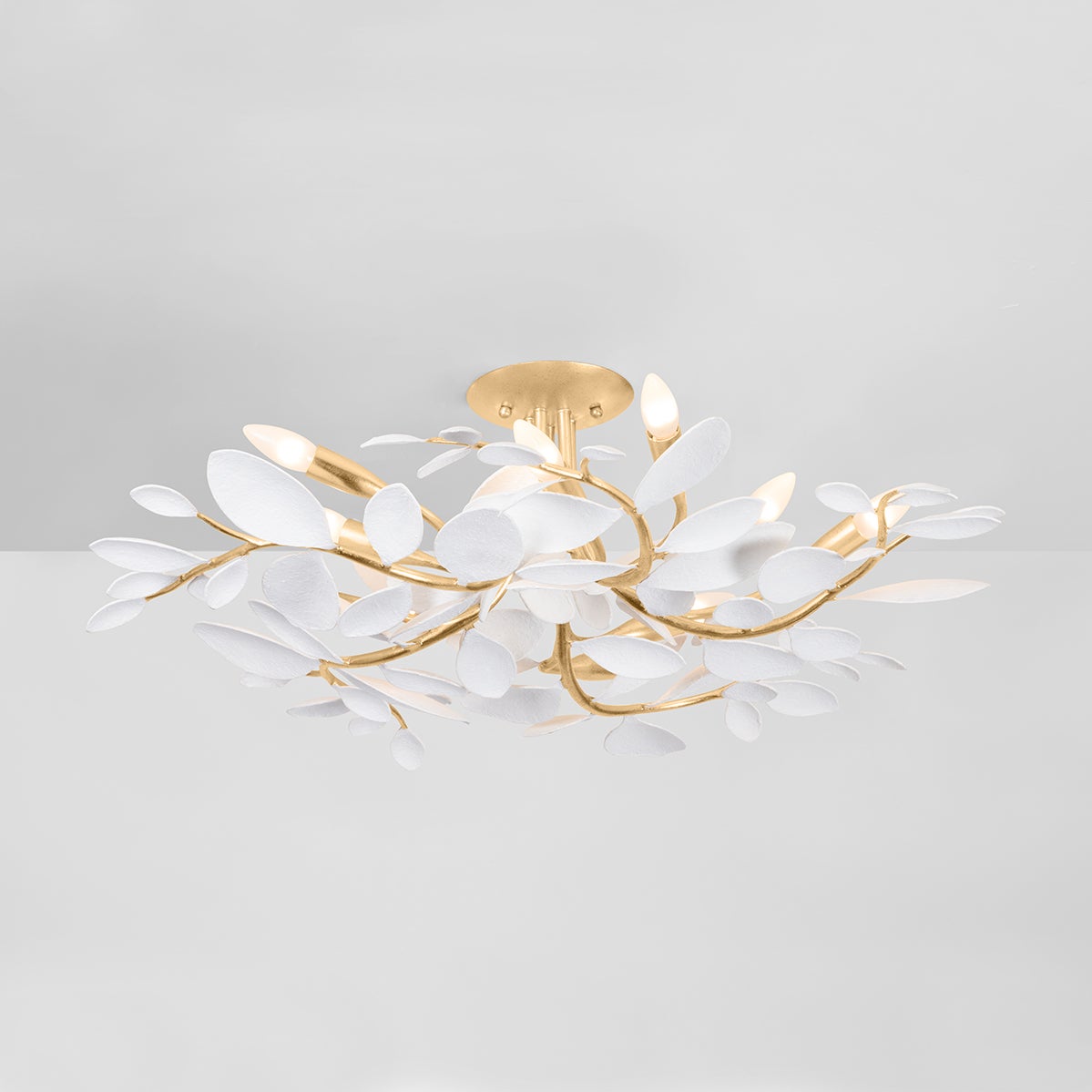 A sophisticated take on a vine-inspired motif, Marabec shines with natural grace. Leaves sculpted from white plaster provide a clean, modern feel extending from warm Gold Leaf branches. The delicately curved framework imparts a sense of movement, energizing interior spaces. Available as a semi-flush in two sizes or as a wall sconce.