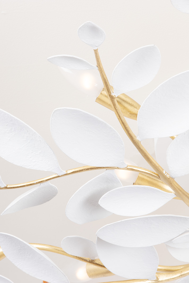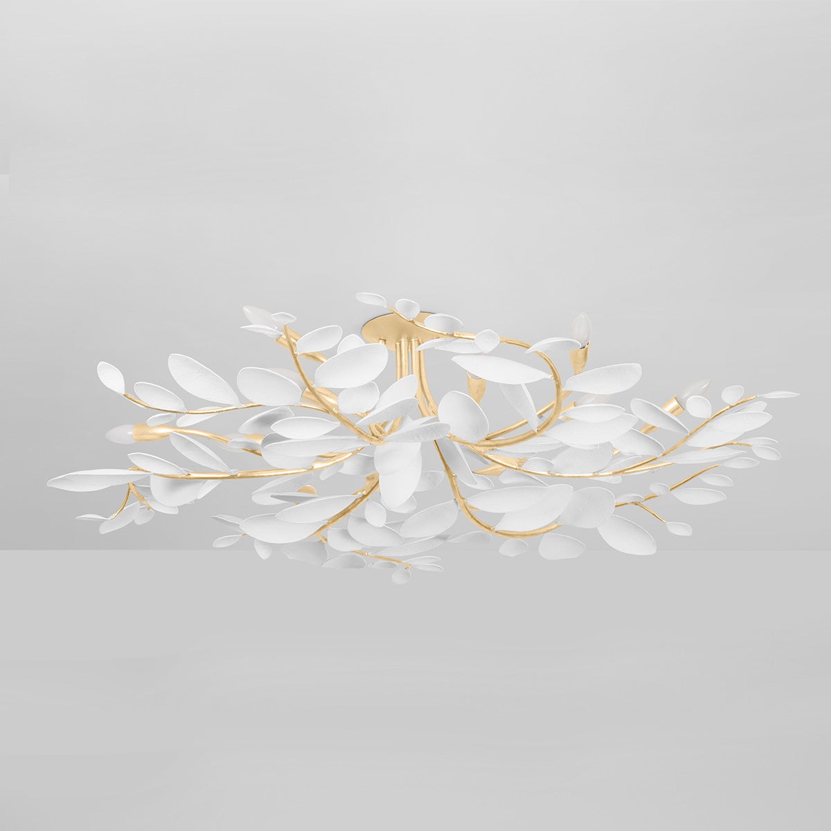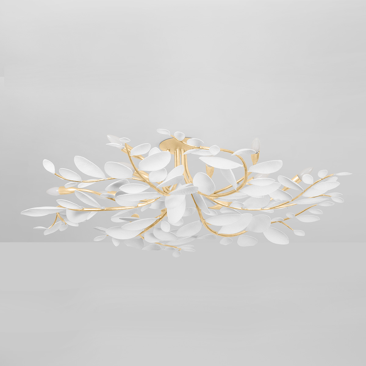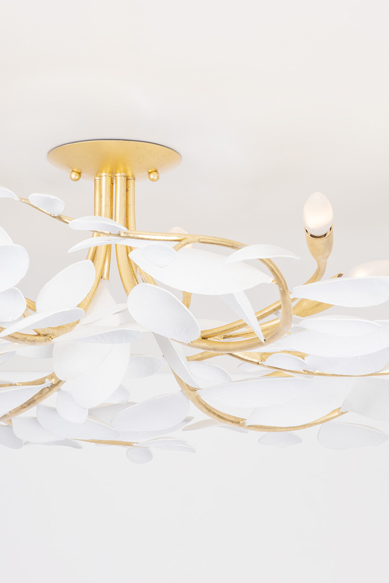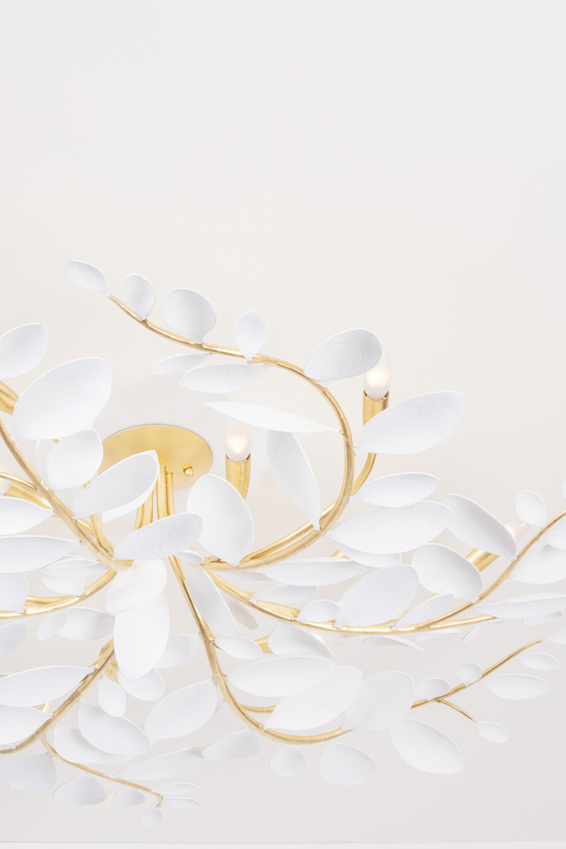 A sophisticated take on a vine-inspired motif, Marabec shines with natural grace. Leaves sculpted from white plaster provide a clean, modern feel extending from warm Gold Leaf branches. The delicately curved framework imparts a sense of movement, energizing interior spaces. Available as a semi-flush in two sizes or as a wall sconce.