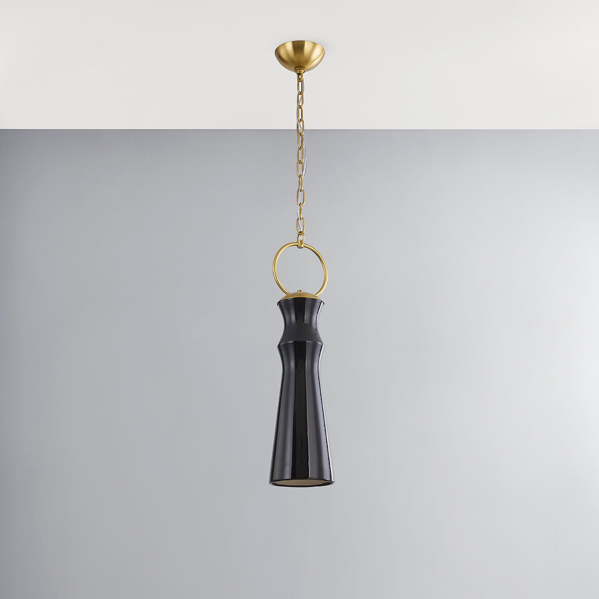 Borden brings an air of tailored elegance to a classic ceramic pendant. An oversized Aged Brass ring gives a jewelry-like feeling to this glamourous pendant, while the soft conical shade pairs perfectly with the high-gloss finish in white or mink.