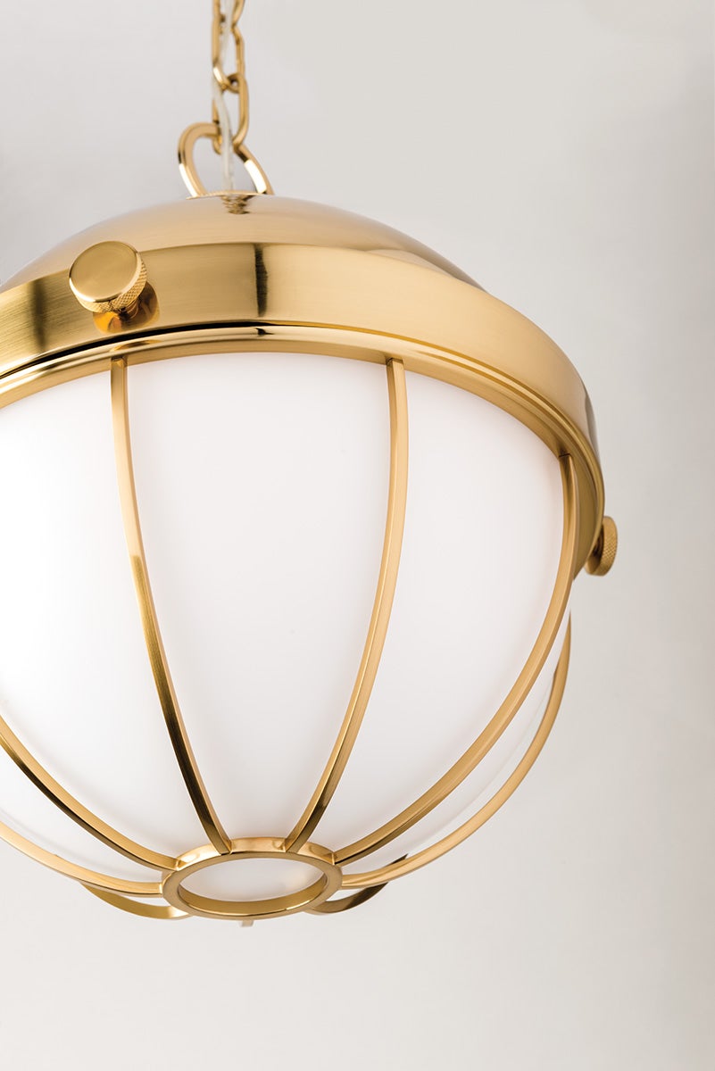 The hanging globe—half opaque white glass diffuser, half metallic shell—is a perennial favorite. In our Sumner family, thumbscrews with lathe-cut knurling add to its industrial evocations.