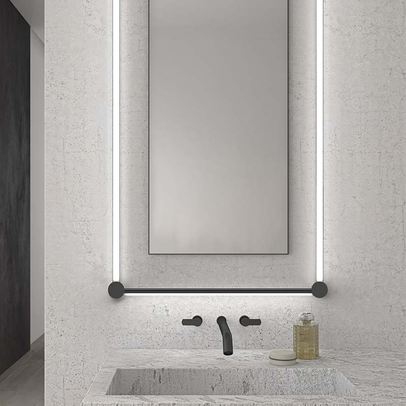 A system of linear tubes, set within the geometry of surface-mounted cylinder brackets, rotate individually to direct the LED illumination in 360 degrees along their axis. Arranged in a linear pattern or along a single path, the possibilities for compositions are endless and unlimited in scalability. Set on a wall, in line behind a bed, the rotatable luminaires provide the variability of direct or indirect illumination.