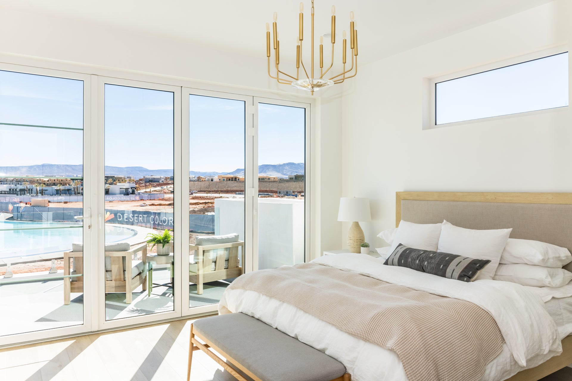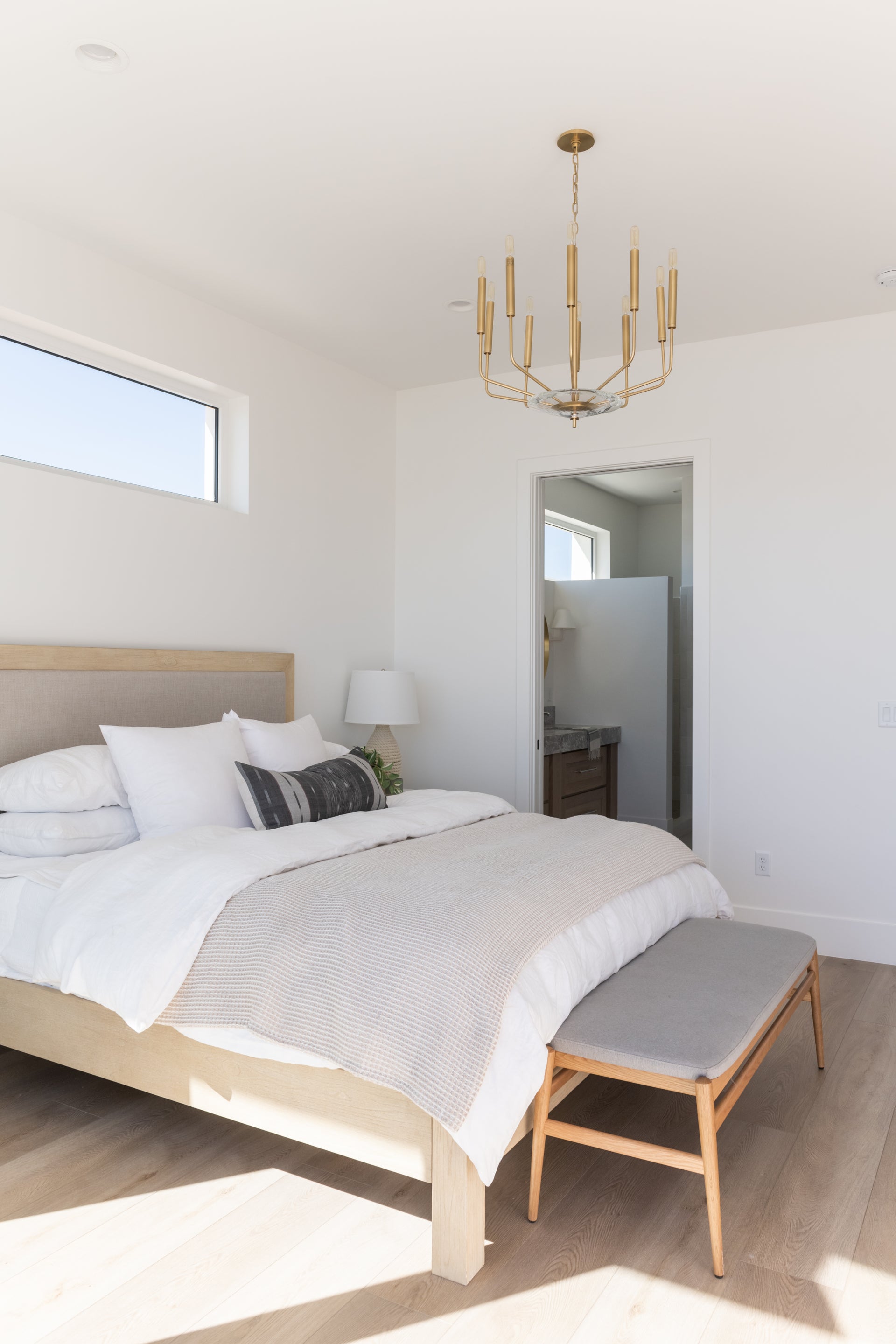 Gideon’s arms are round rods bent at obtuse angles, submerging into long tubes of metal the same diameter as the tubular bulbs which fit into them. In its chandelier form, a large crystal plate at its base, secured between arms and finial, adds just the right accent to Gideon’s minimalism.