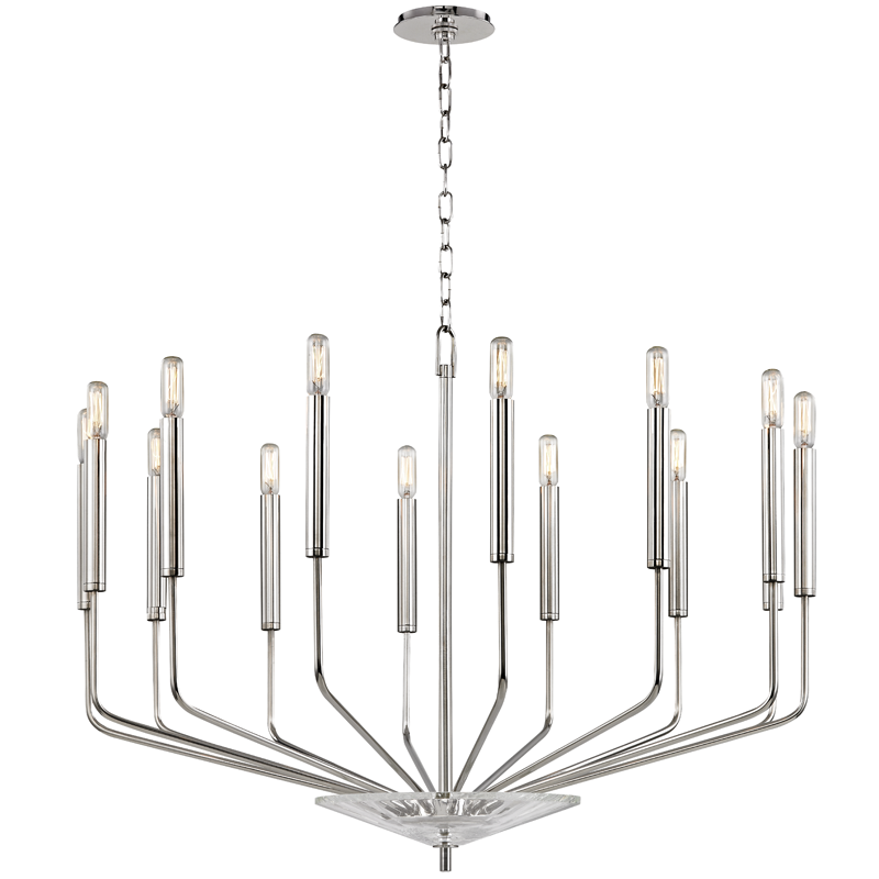Gideon’s arms are round rods bent at obtuse angles, submerging into long tubes of metal the same diameter as the tubular bulbs which fit into them. In its chandelier form, a large crystal plate at its base, secured between arms and finial, adds just the right accent to Gideon’s minimalism.