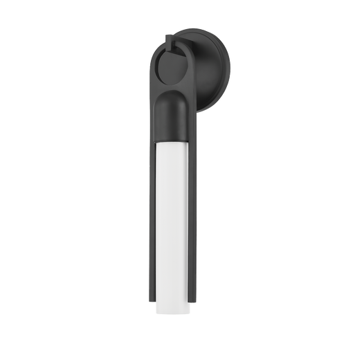 The sleek, unique silhouette of this sconce features a slender opal glossy glass shade wrapped in Aged or Black Brass and hooked to the round backplate by a loop, creating the illusion that the fixture is floating in front of the wall. Hardware-inspired, this refined modern sconce has a slight industrial vibe.