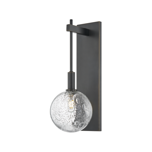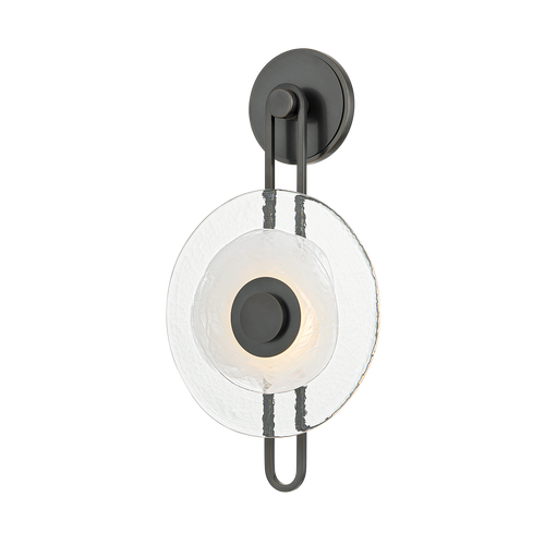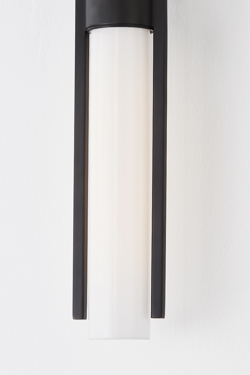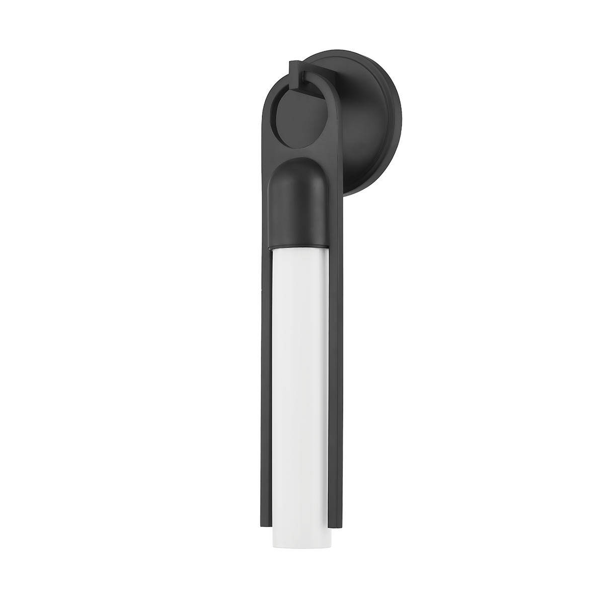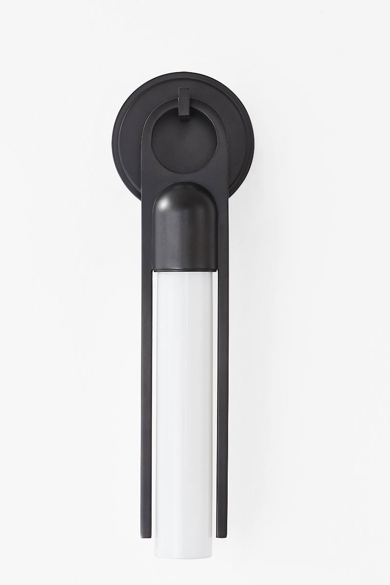 The sleek, unique silhouette of this sconce features a slender opal glossy glass shade wrapped in Aged or Black Brass and hooked to the round backplate by a loop, creating the illusion that the fixture is floating in front of the wall. Hardware-inspired, this refined modern sconce has a slight industrial vibe.
