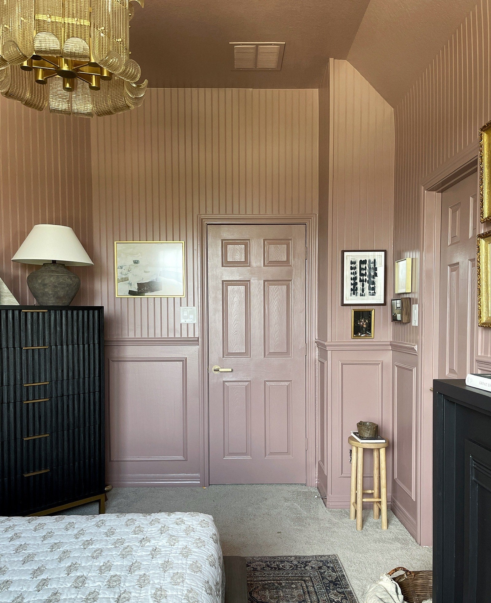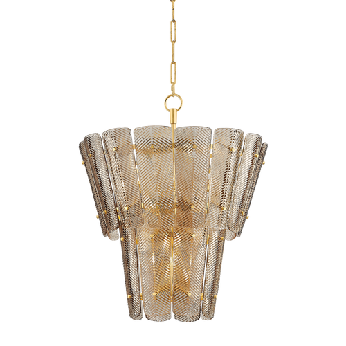 Glass is hand-poured into molds, then bent to form the distinctive panels that are the first thing you notice when you look at Brasher. The texture of these panels refracts the light coming through, while the glass itself is infused with a soft champagne hue. The metal work is aesthetically pleasing in its own right, seen from underneath, glimpsed obscurely through the diffusers, and accentuated with spherical attaching pins.
