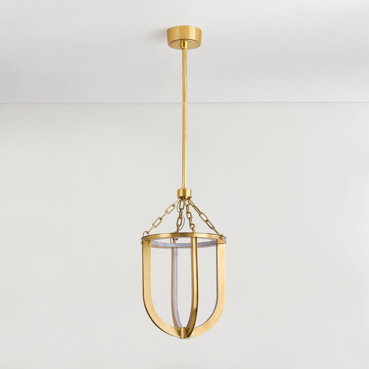 Inspired by a lantern, Tournu features an open cage-like silhouette with LED lining its interior. It is elegantly suspended from the ceiling by a single sleek rod, illuminating a wide area. Available in two sizes with the choice of an Aged Brass or Matte White Acrylic finish, it adds an artful note to living and commercial spaces.
