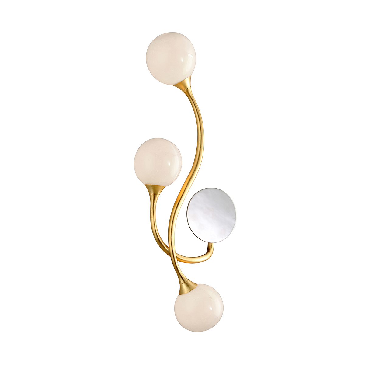 With its fluid silhouette and antique Gold Leaf finish, Signature offers a brilliant take on modern artisan effect. Delicately hand-crafted arms gracefully clutch white pearl-like shades, giving depth, beauty and texture to any space.