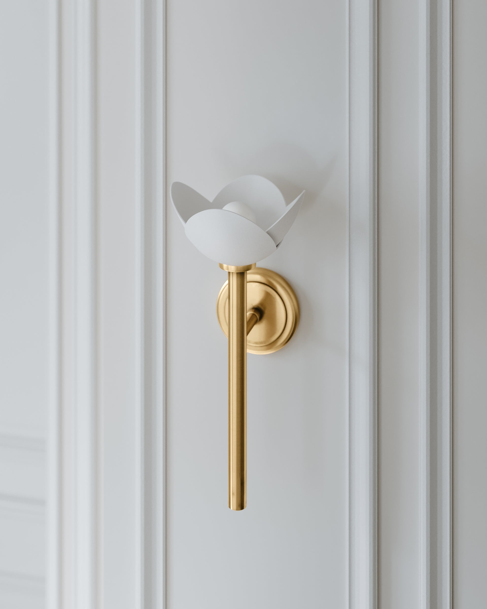 Pretty, petal-shaped shades give a softness to this modern botanical design, while gold leaf arms, canopy, and backplate add shine and color for a balanced aesthetic. This delicate design will bring a warm glow and a sense of organic glamour anywhere it is placed.