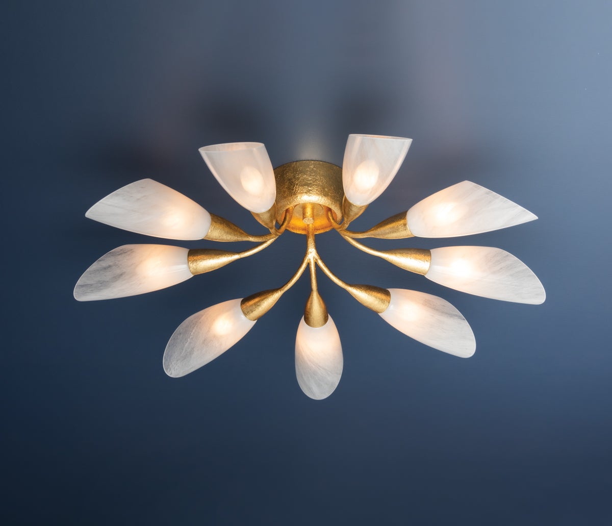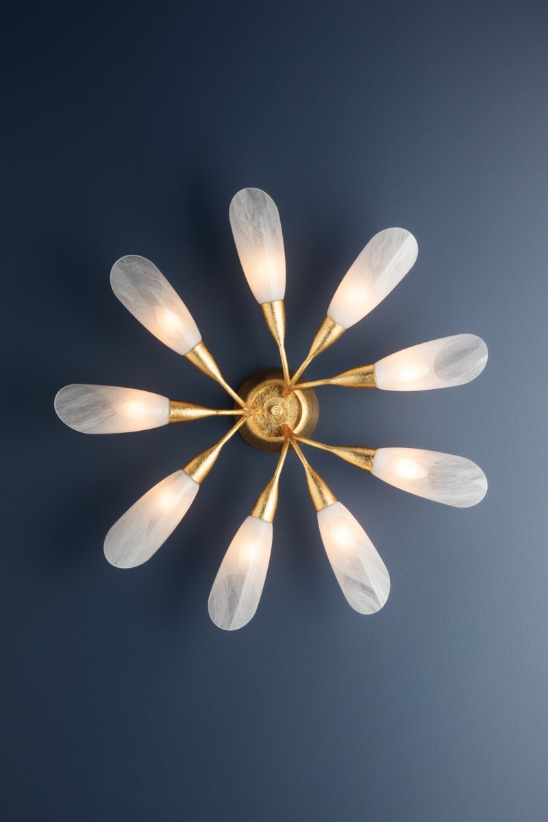 The botanical silhouette of Enfield features a sleek branching profile in scaled-up proportions. Cloud glass shades inspired by floral blooms offer a soft, contemporary feel with bias-cut ends that direct light upwards. The elongated, slender ‘stems’ embody a modern aesthetic, enhanced by the luxurious Vintage Gold Leaf finish.