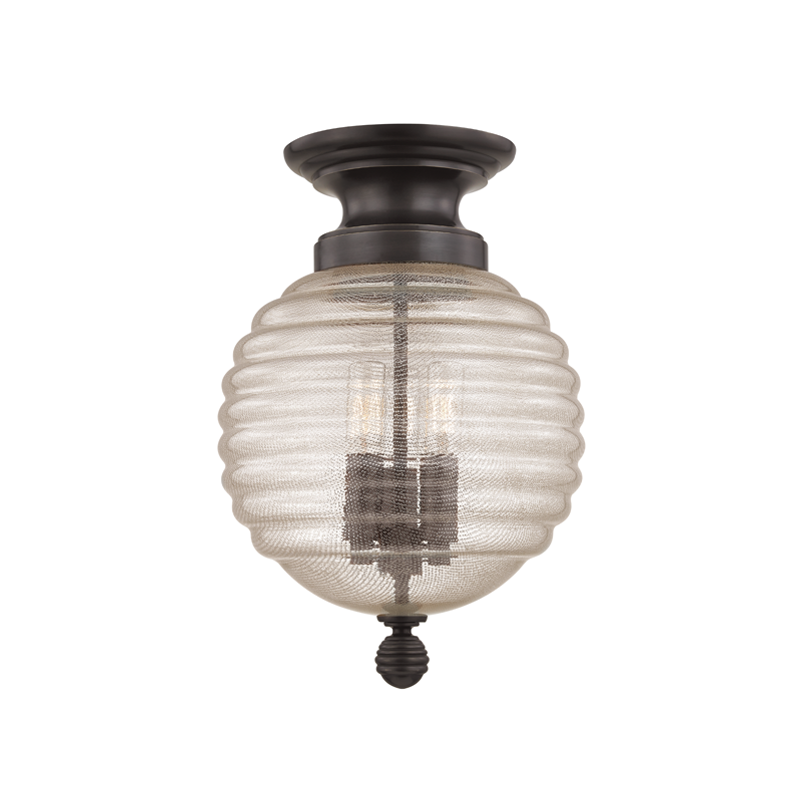 Brass mesh dissolves into spun glass in our Coolidge family. Its unifying theme is the beehive, with the iconic shape most prominently displayed in its artisanal diffuser. Cast metal canopy and finial spin subtle variations on the spherical shape.
