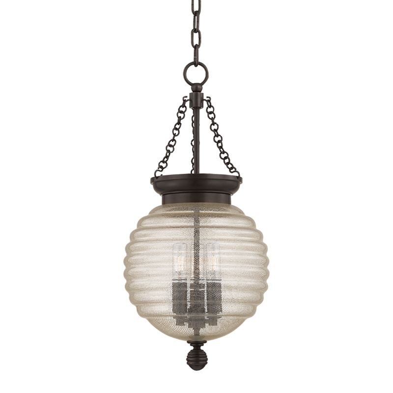 Brass mesh dissolves into spun glass in our Coolidge family. Its unifying theme is the beehive, with the iconic shape most prominently displayed in its artisanal diffuser. Cast metal canopy and finial spin subtle variations on the spherical shape.