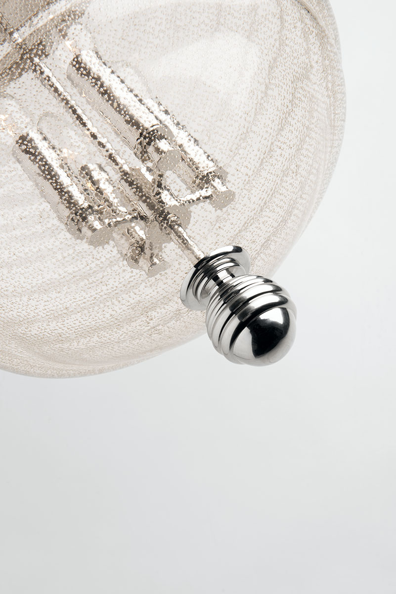 Brass mesh dissolves into spun glass in our Coolidge family. Its unifying theme is the beehive, with the iconic shape most prominently displayed in its artisanal diffuser. Cast metal canopy and finial spin subtle variations on the spherical shape.