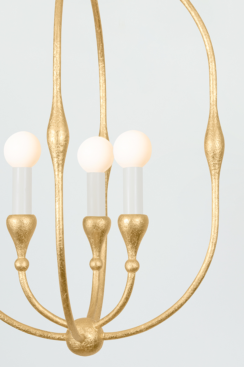 Rooted in French design aesthetics, this chandelier features an oval hanging frame with three or four candle lights, radiating a warm and inviting glow from within. A blend between a lantern and a globe, this design reinterprets a classic silhouette to align with modern preferences for open and airy fixtures. Baltic is available in two sizes and two finishes; Vintage Gold Leaf or Aged Iron.