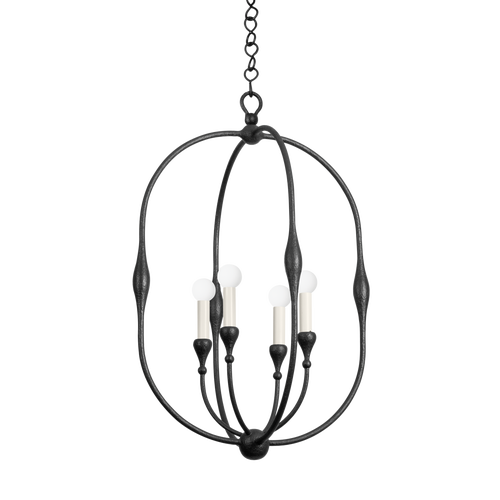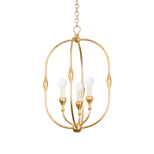 Rooted in French design aesthetics, this chandelier features an oval hanging frame with three or four candle lights, radiating a warm and inviting glow from within. A blend between a lantern and a globe, this design reinterprets a classic silhouette to align with modern preferences for open and airy fixtures. Baltic is available in two sizes and two finishes; Vintage Gold Leaf or Aged Iron.