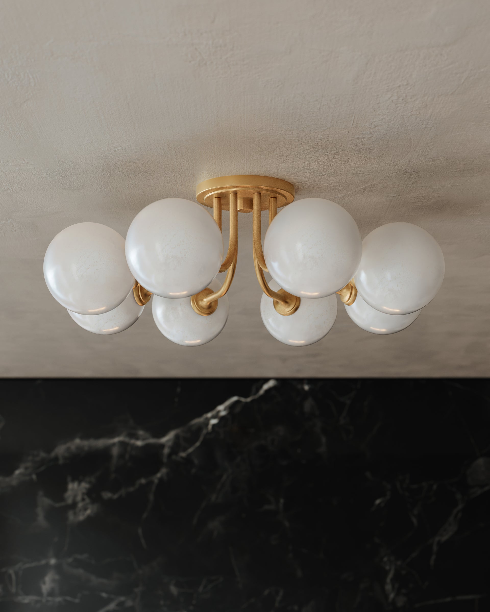 Small globes of opal cloud glass rest on sprawling, curved arms giving Onyx an uplifted and airy feel. Etched on the inside, the globes create a warm light. An extra layer of patina gives the gold leaf finish on the metal work its vintage look. Available as a single or 3 light sconce, 8 light flush mount or 6 or 12 light chandelier, there's a place for Onyx in any space.