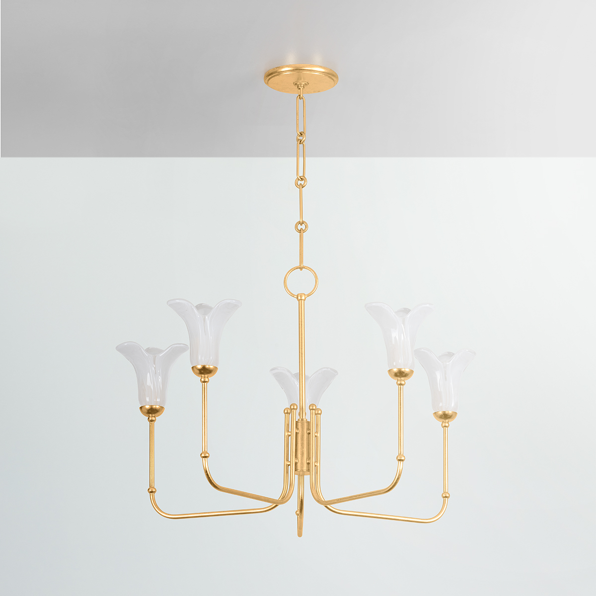 In tribute to the beauty of nature, white Bianca glass shades resembling flowers bloom upwards, supported by slender Vintage Gold Leaf arms. With an opaque quality, the shades soften the bulbs within, creating a gentle diffusion of light. Like fine jewelry, delicately inlaid gold beads embellish the arms of this fixture, further enhancing the romantic quality. Rooted in Art Deco design, Montclair is available as a wall sconce or chandelier in two sizes.