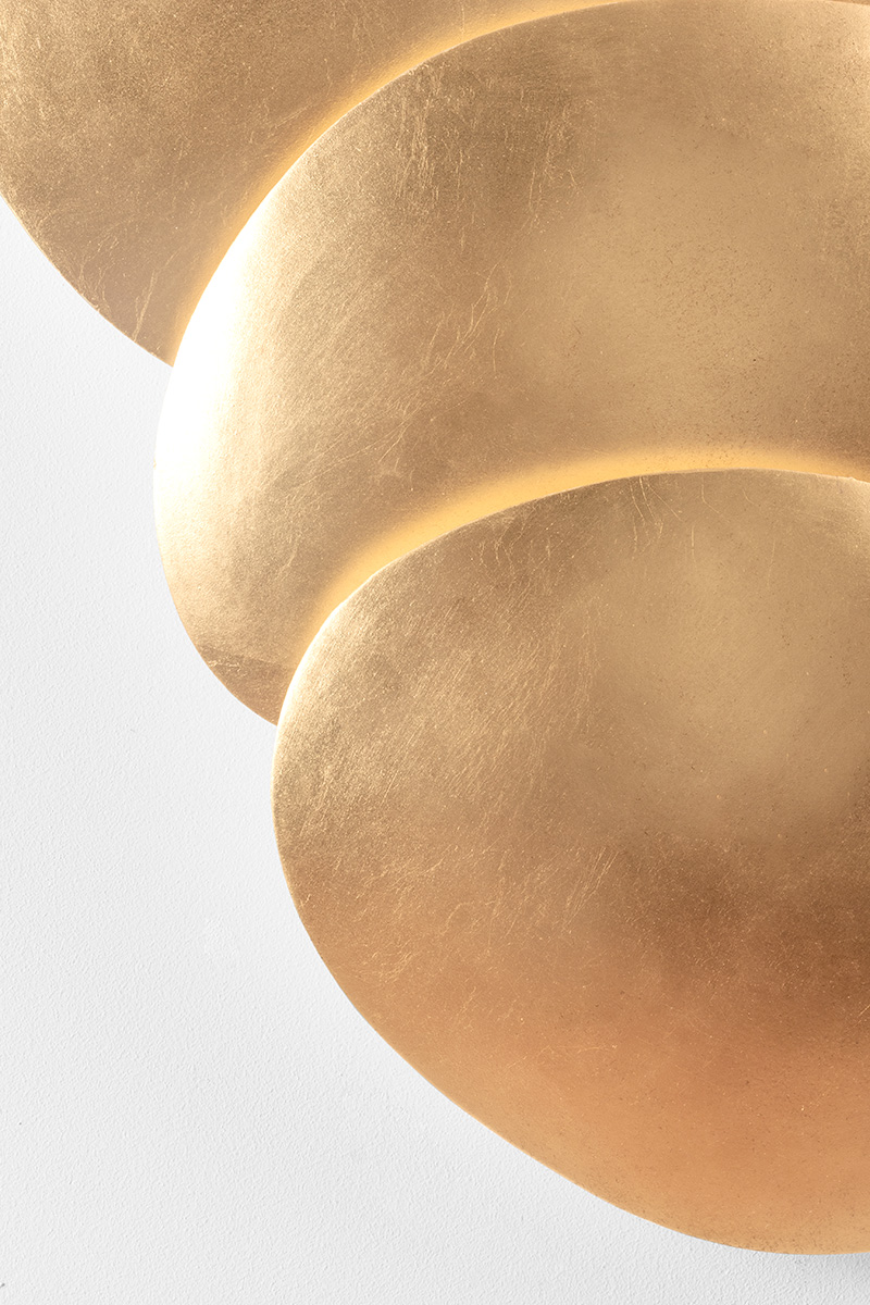Reminiscent of stacked stones, Akemi features a series of layered, rounded forms clustered around a light source. Light washes over the forms as well as the wall creating a soft, beautiful glow. This wall-mounted sconce is available in Vintage Gold Leaf, Warm Silver Leaf and Gesso White finishes to add a modern, natural style to any space.