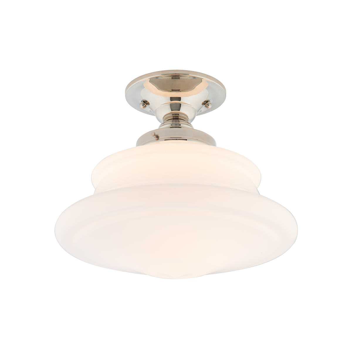 Evoking vintage schoolhouse glass, Petersburg features a mouth-blown glossy opal diffuser. To create this elaborate shape, a skilled artisan works molten glass into a special form called a “paced mold,” which is simultaneously turned by an assistant. With careful timing, the team produces a seamless piece of beautifully detailed glasswork.