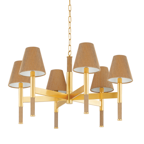 Wrapped, woven, and precision-fitted elements elevate the traditional silhouette of Lindenwood. Creating an exciting conversation between natural and manmade elements, the Aged Brass metalwork supports grasscloth-covered stems and shades. Available as a 1-light sconce and a 6 and 9-light chandelier, Lindenwood fixtures layer well together in a contemporary space.