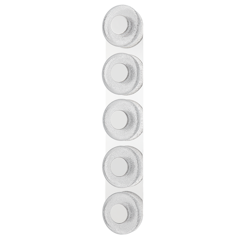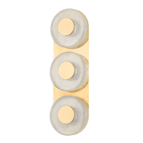Combining simple shapes, a slim profile and luxe materials to make a big impact, this modern design features thick circles of clear cast glass displayed around rings of Vintage Brass or Polished Nickel. The glass is lit from behind, highlighting the chill marks and adding texture and gorgeous refraction. The three- and five-light sconces can be mounted vertically or horizontally for even more versatility.