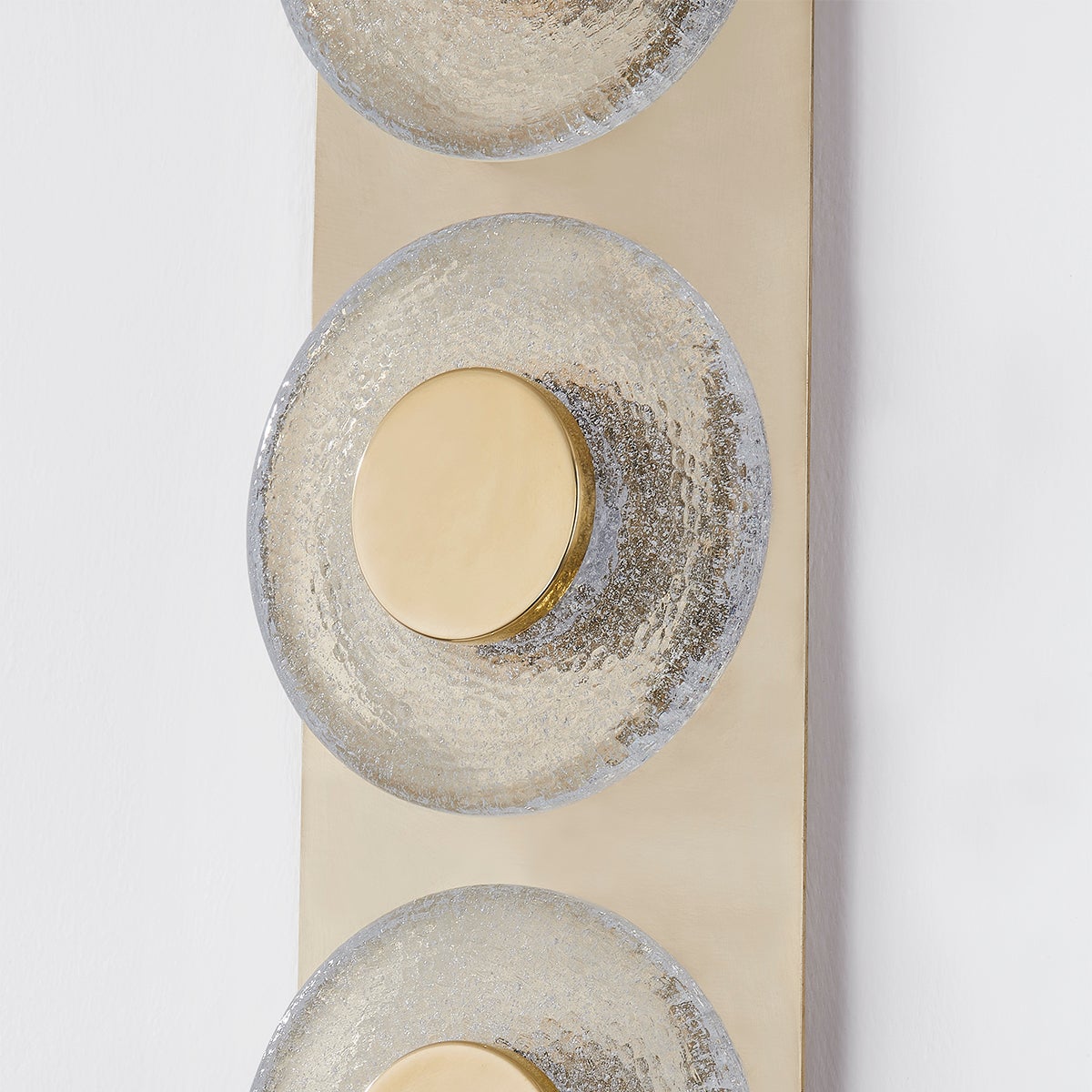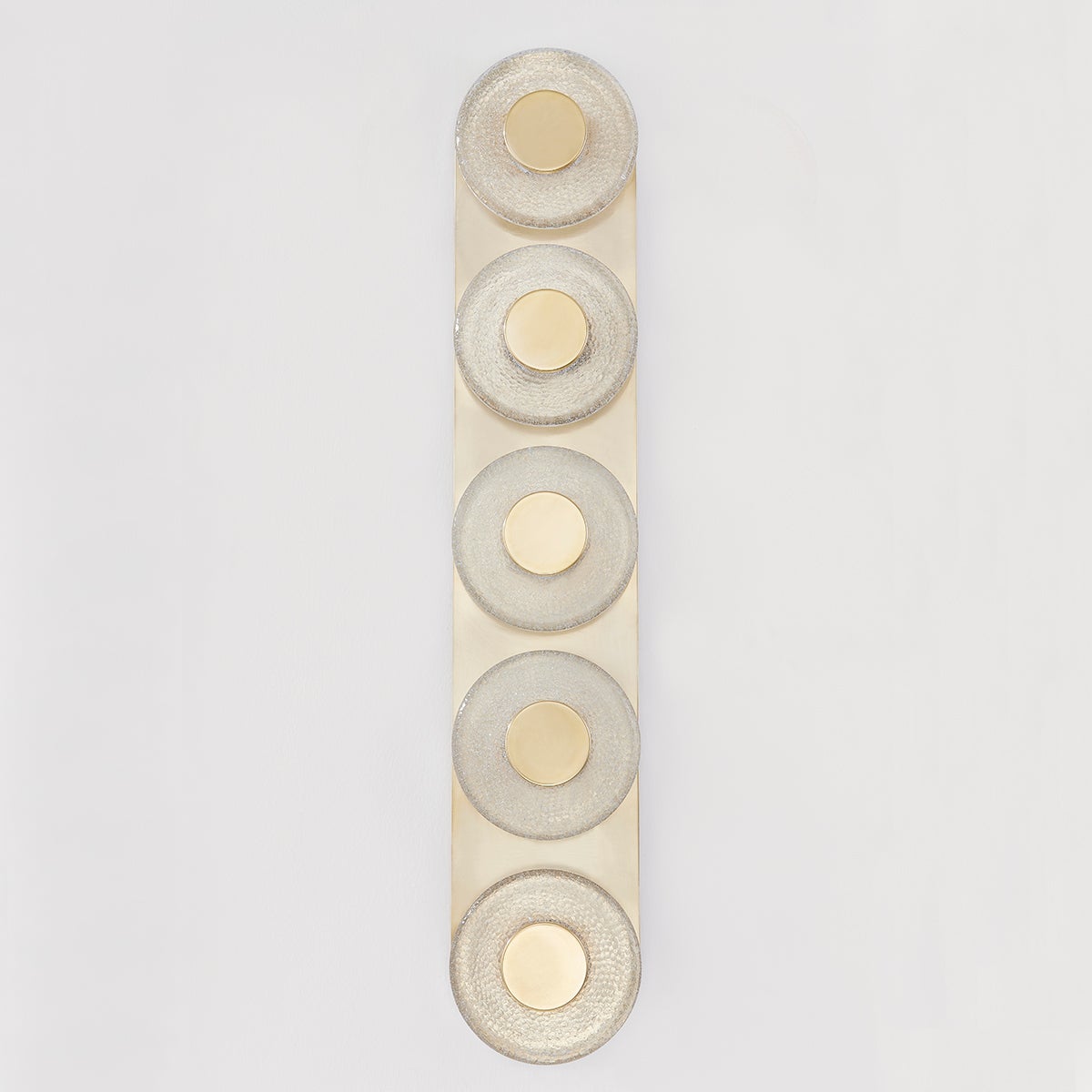 Combining simple shapes, a slim profile and luxe materials to make a big impact, this modern design features thick circles of clear cast glass displayed around rings of Vintage Brass or Polished Nickel. The glass is lit from behind, highlighting the chill marks and adding texture and gorgeous refraction. The three- and five-light sconces can be mounted vertically or horizontally for even more versatility.