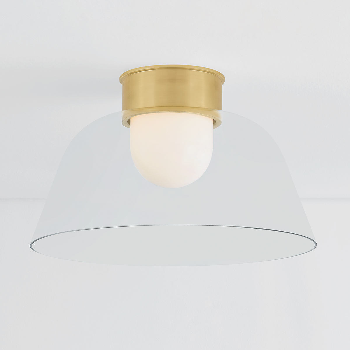 A celebration of the beauty of pared-down forms, Lakeside features an opal glossy inner diffuser surrounded by a clear outer glass layer. Shaped like a graceful bowl, this flush mount forgoes ornamentation save for its extra-tall metal canopy. Available in Aged Brass or Distressed Bronze finishes, the streamlined metalwork adds a decorative note to the minimalistic design.