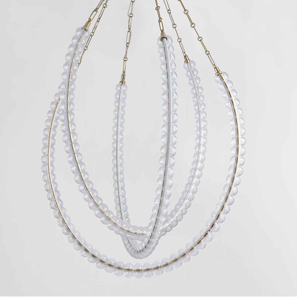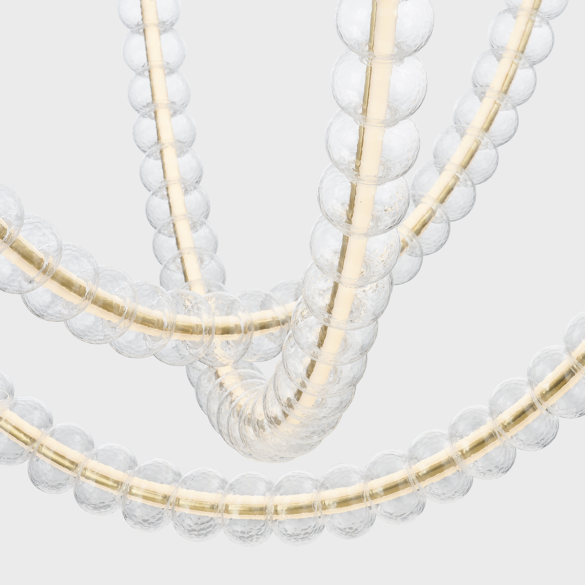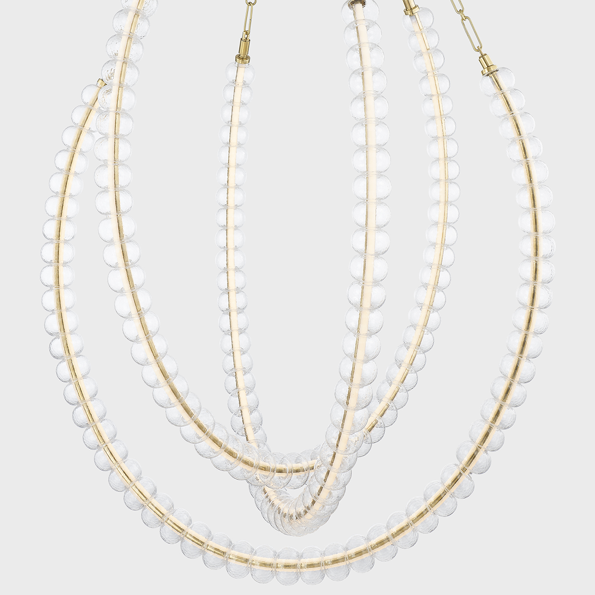 Add instant drama overhead with this show-stopping, jewelry-inspired chandelier. Clear cast glass beads are strung through swooping LED tubes with a Vintage Brass finish. Three of the beaded tubes are then strung around each other and hung from the canopy. The result is a gorgeous, airy teardrop silhouette that puts on a dazzling display when lit.