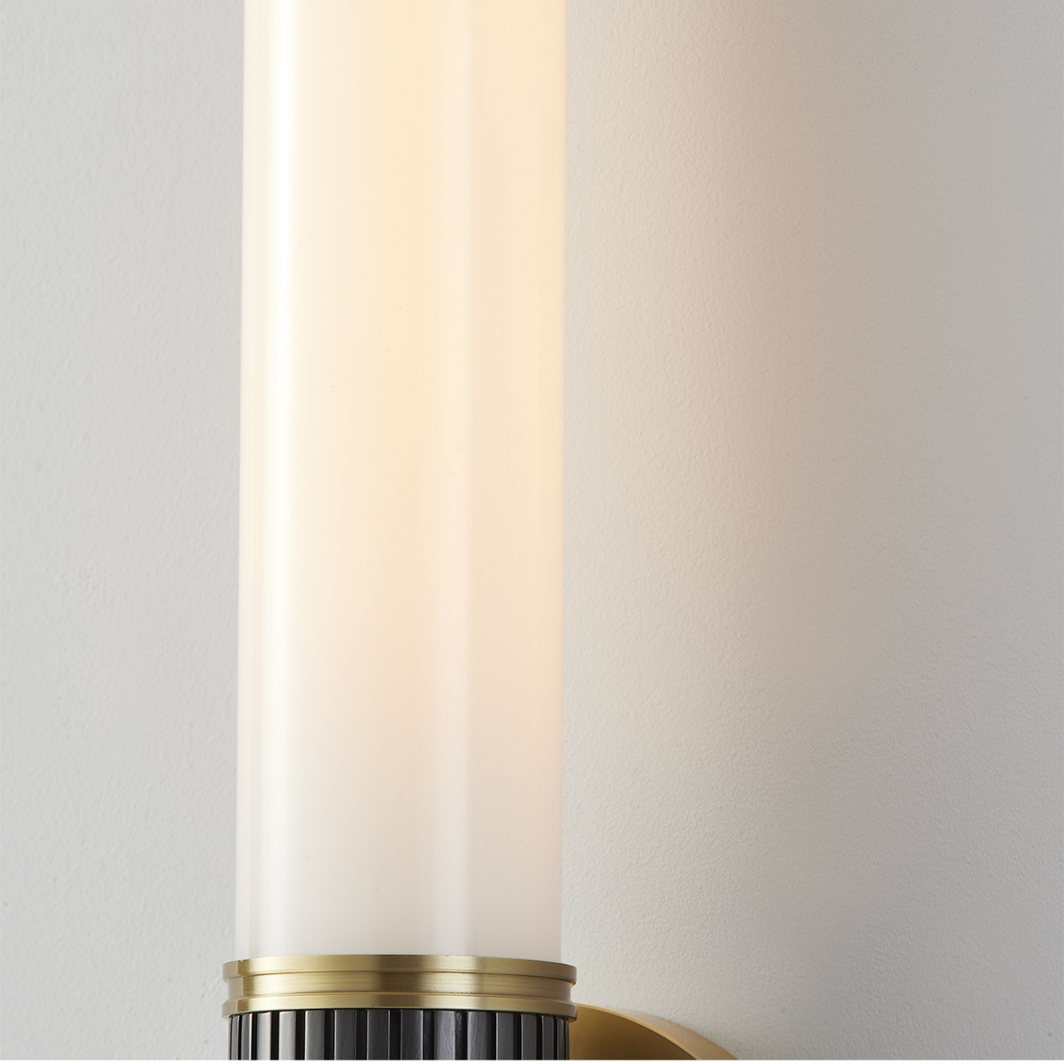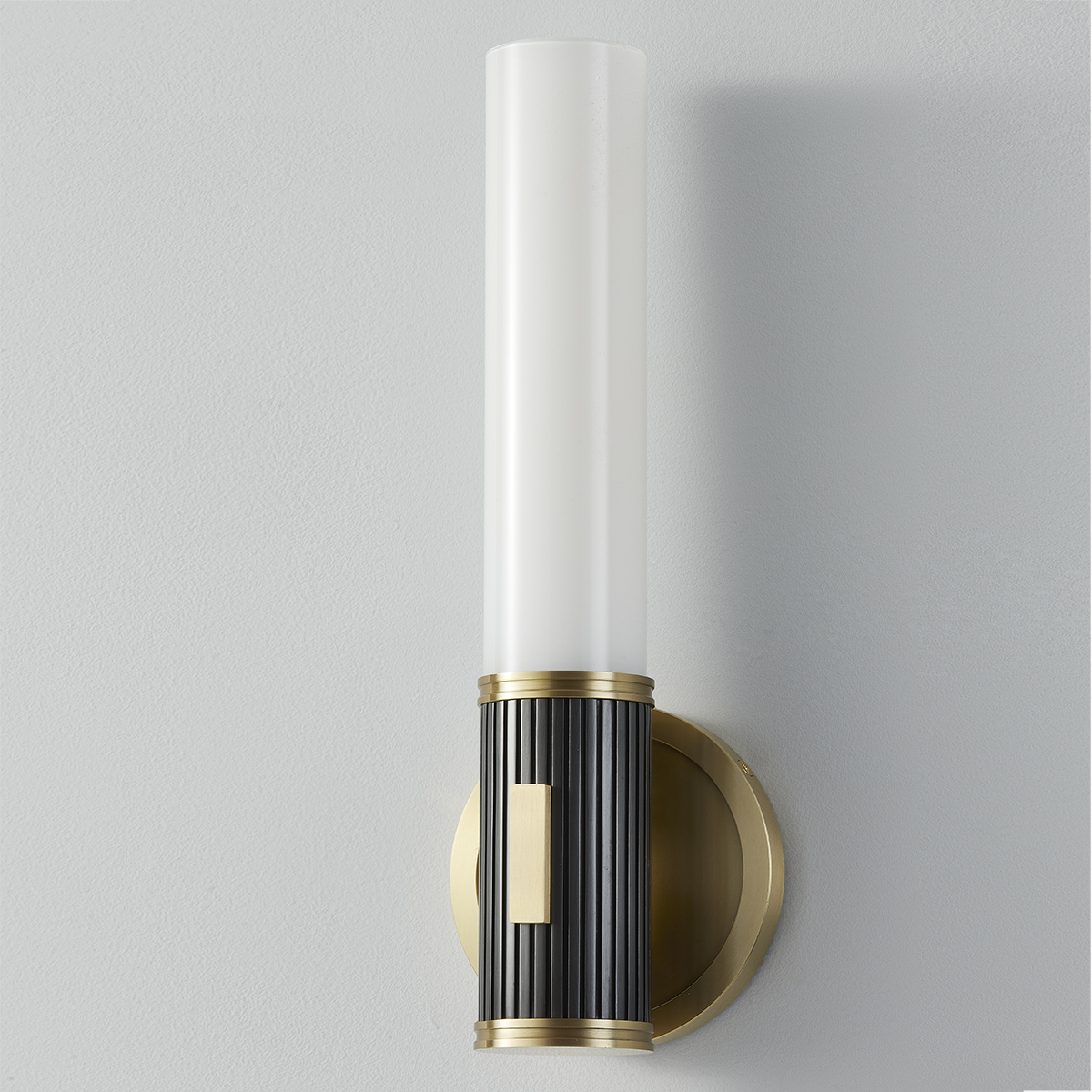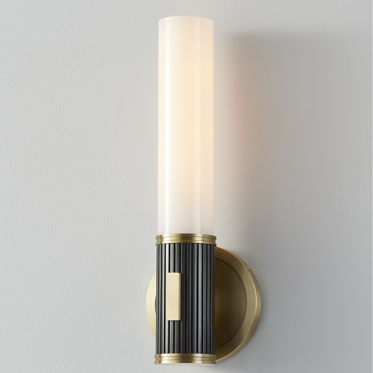 Crewe is an elevated tubular wall sconce characterized by a simple medallion style backplate, matching accents, and a contrasting fluted Black Bronze arm. Available in Aged Brass or Polished Nickel in a 1-light or 2-light sconce that doubles as a bath bar when mounted horizontally.