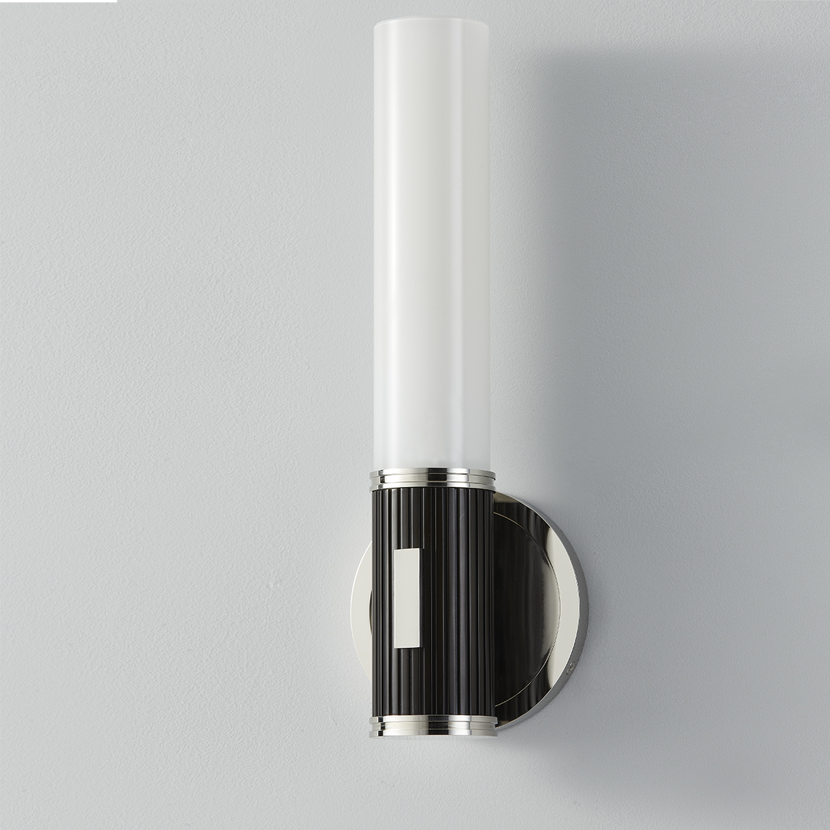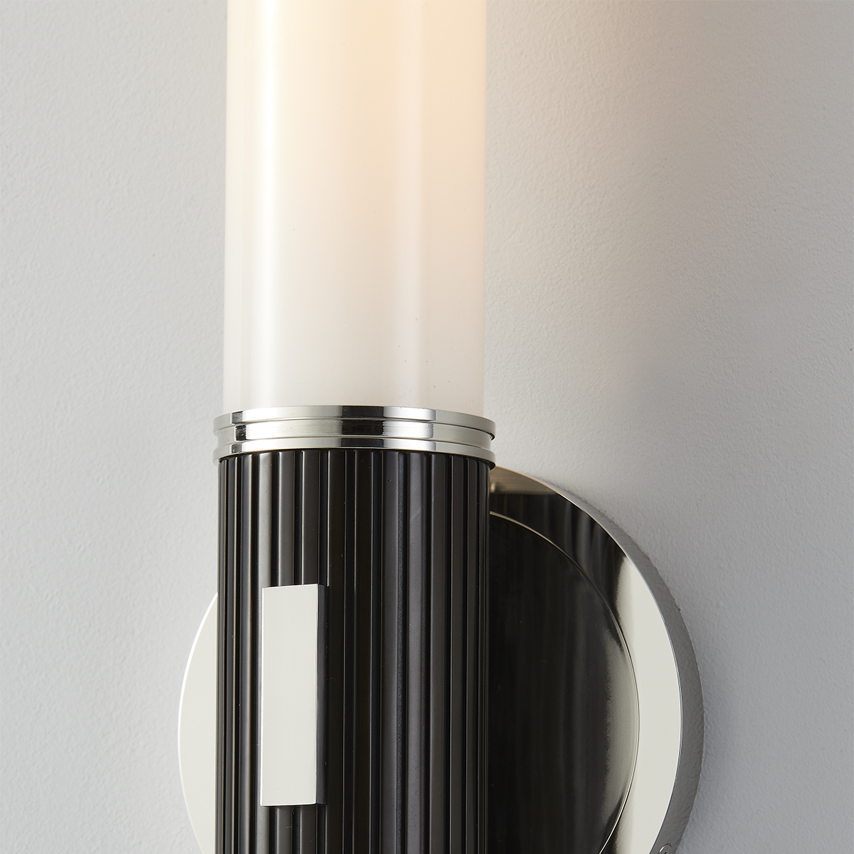Crewe is an elevated tubular wall sconce characterized by a simple medallion style backplate, matching accents, and a contrasting fluted Black Bronze arm. Available in Aged Brass or Polished Nickel in a 1-light or 2-light sconce that doubles as a bath bar when mounted horizontally.